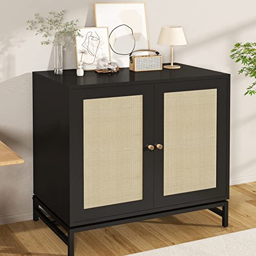 Rattan Cabinet Set of 2,Sideboard Buffet Cabinet with Storage,Accent Cabinet Kitchen Storage Cabinet with 2 Doors/Adjustable Shelves,Cupboard Console Table for Dining Room, Hallway,Black