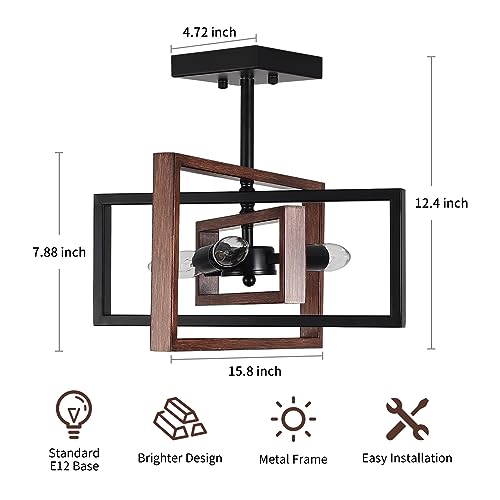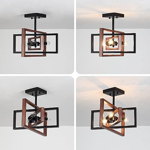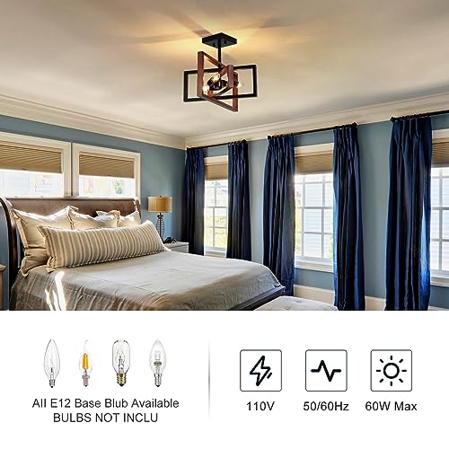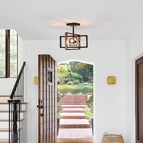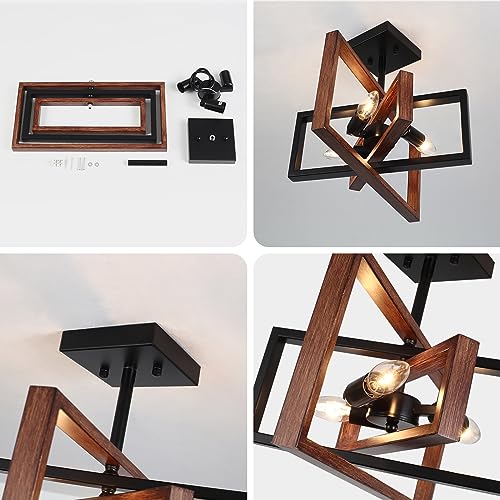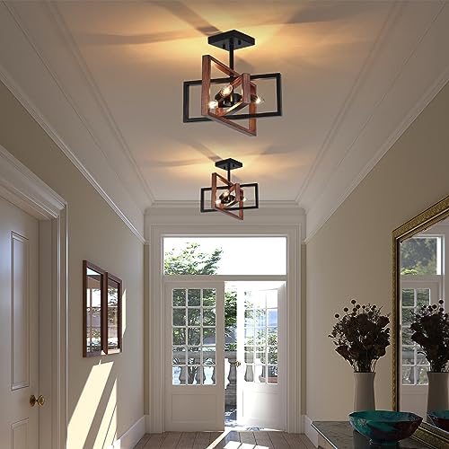 3-Lights Industrial Rectangle Semi Flush Mount Light Fixture,Black Vintage Ceiling Light Fixtures with Metal Square Frame Modern Chandelier for Kitchen Living Room Bedroom Hallway Entryway