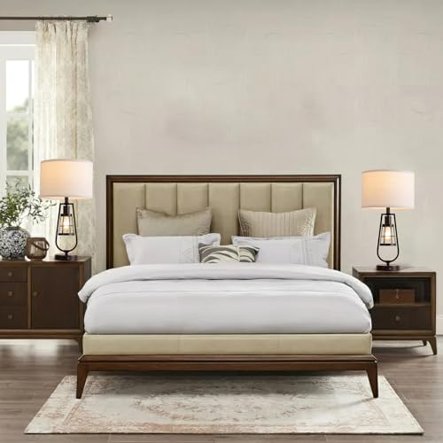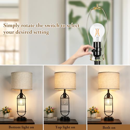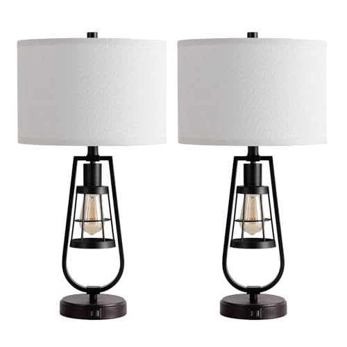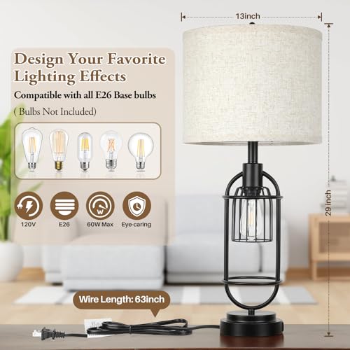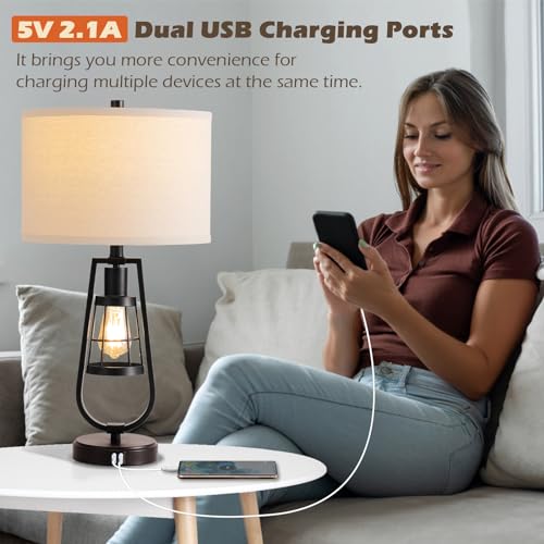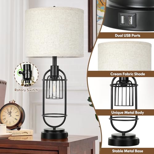 VerRon Industrial Touch Table Lamps with USB Port, 3-Way Dimmable Farmhouse Bedside Nightstand 2-Lights Lamps for Bedroom Living Room Reading, Cream Fabric, Black Metal Base, Bulbs Included