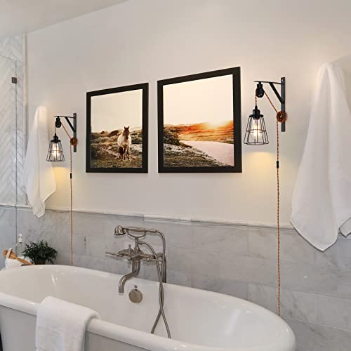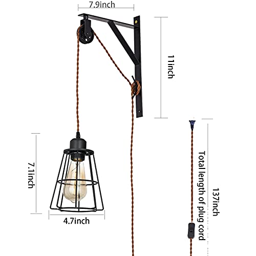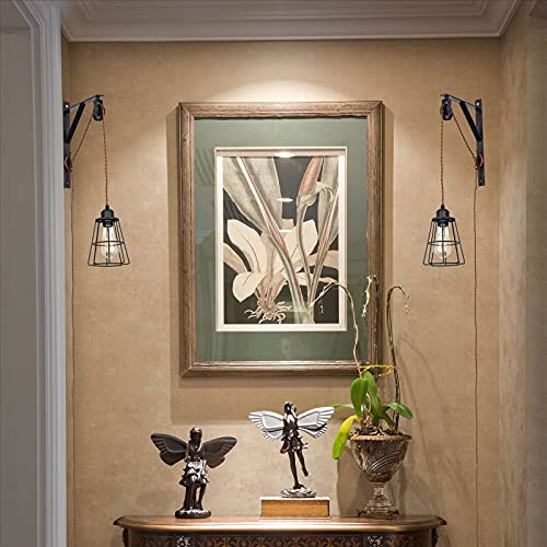 YILYNN Industrial Rustic Cage Wall Lamp Bracket Pulley Lights Fixture, Farmhouse Pendant Lamp Adjustable Hanging with Plug in Cord - Retro Wall Sconce for Indoor Living Room Restaurant (2-Pack)