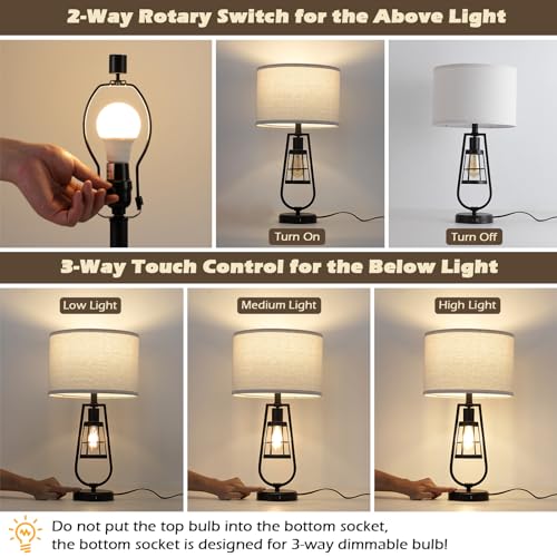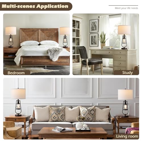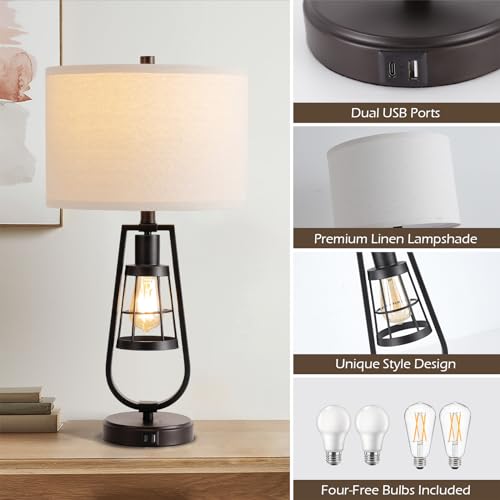Industrial Table Lamp Set of 2 with USB Ports, Touch Control 3-Way Dimmable Bedside Lamp with Nightlight, Farmhouse Rustic Nightstand Lamp for Living Room Bedroom Office