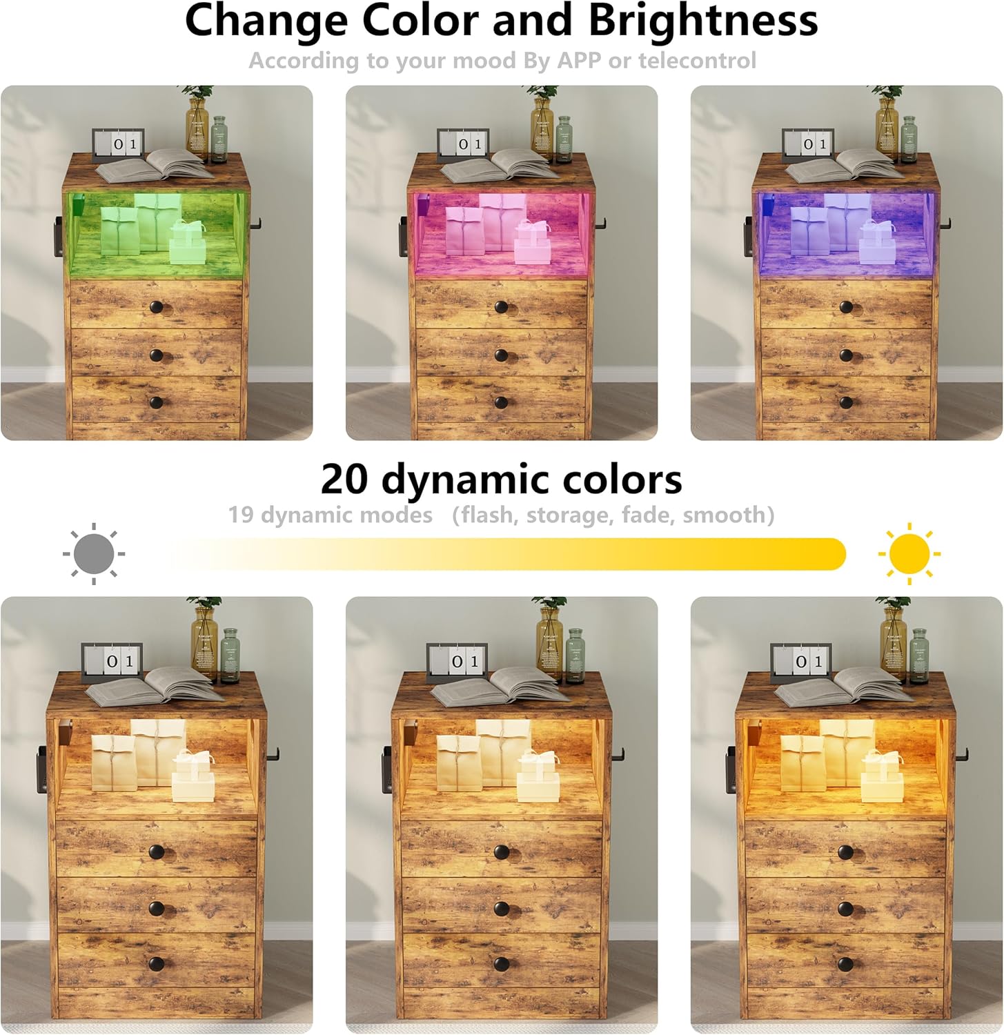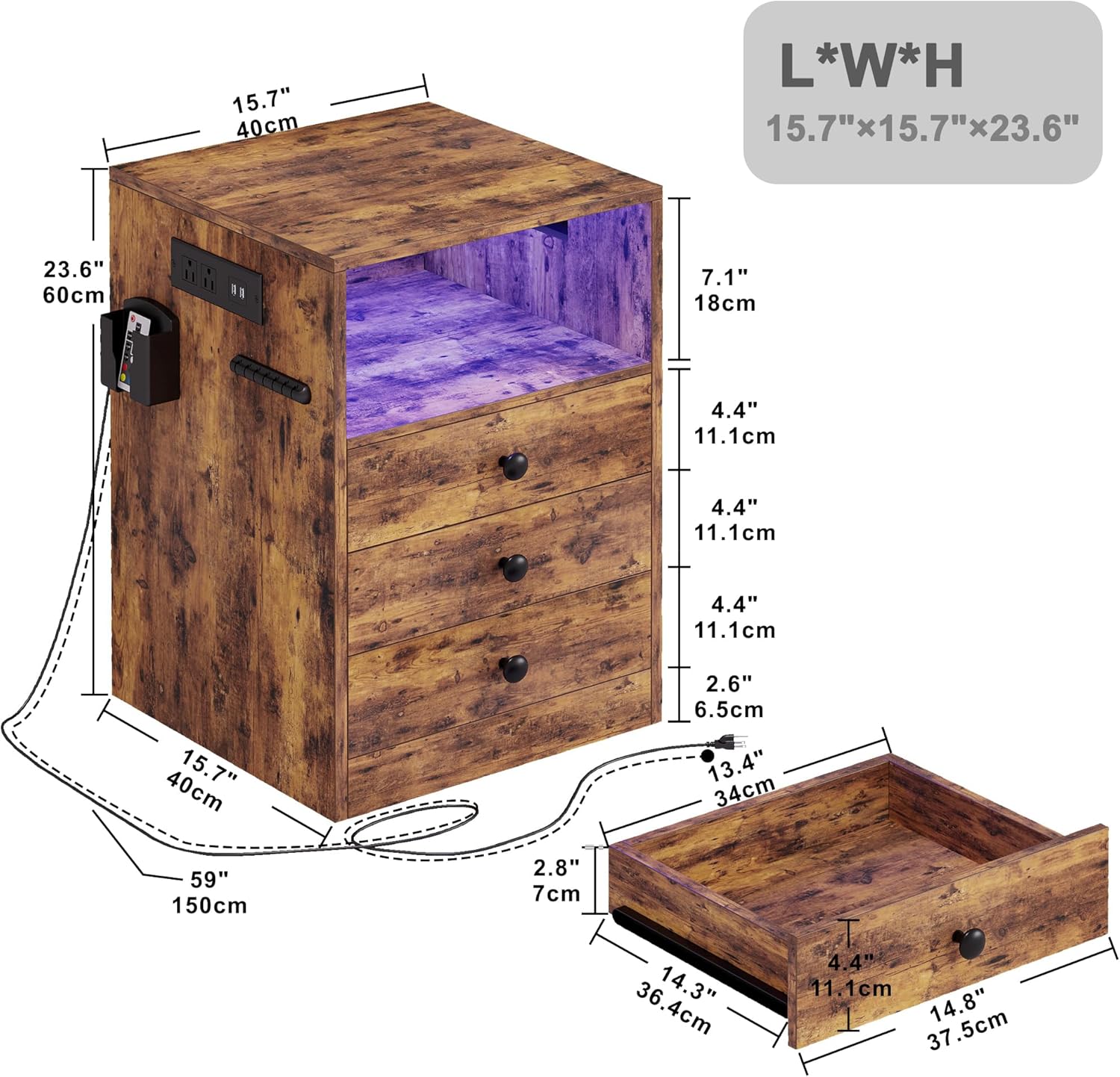 LIKIMIO Vanity Desk with LED Lighted Mirror & Nightstand with Charging Station and 3 Drawers, Vintage Brown