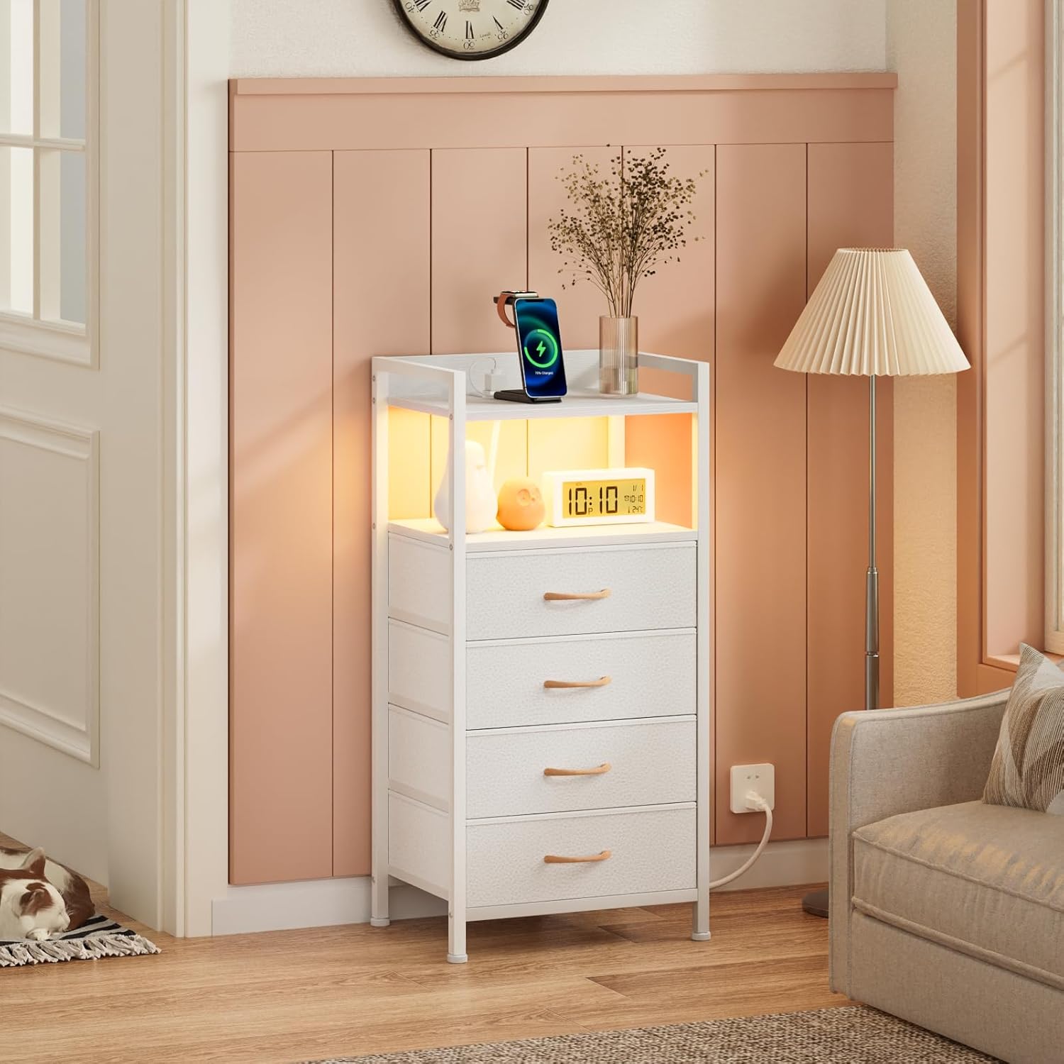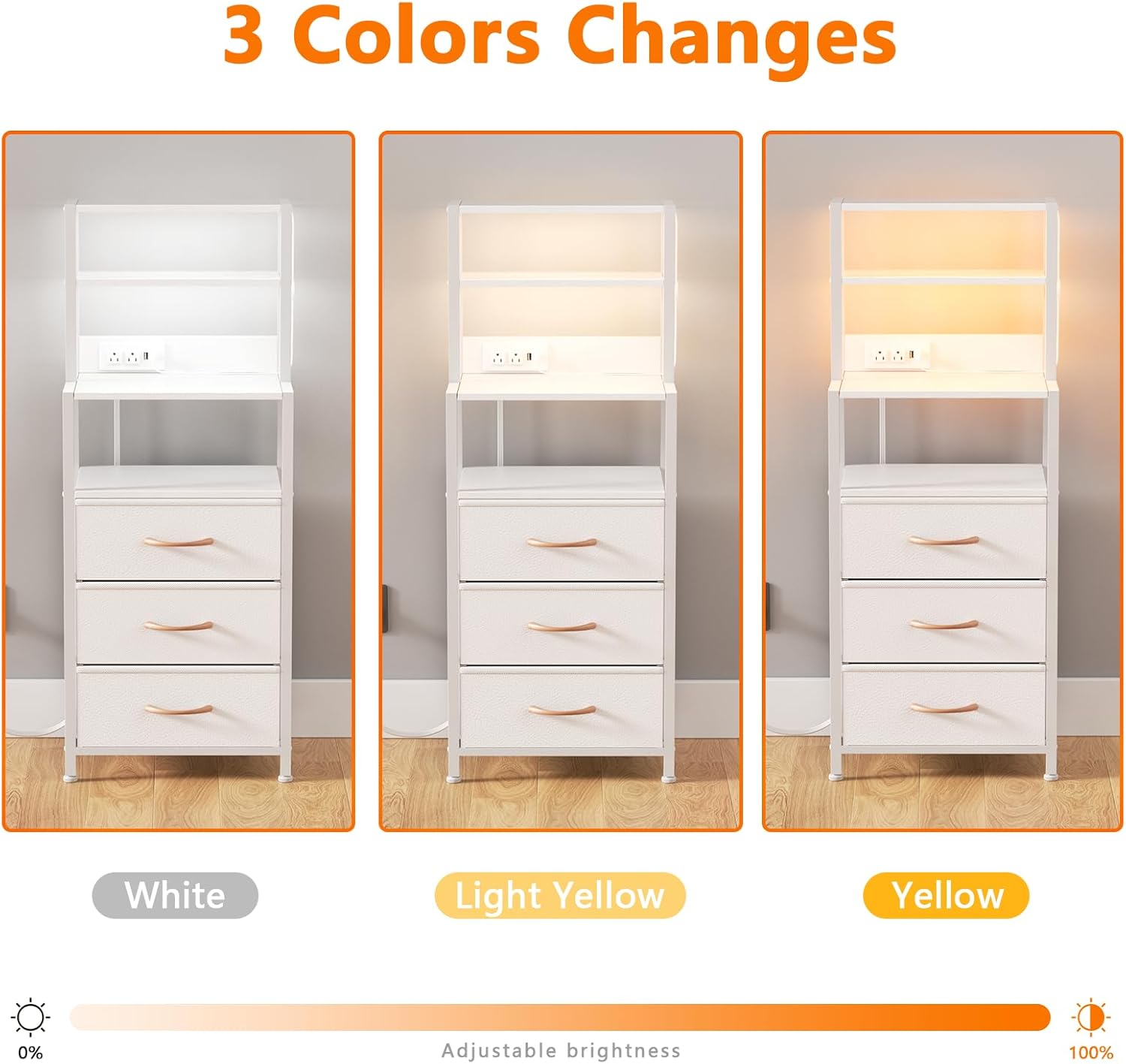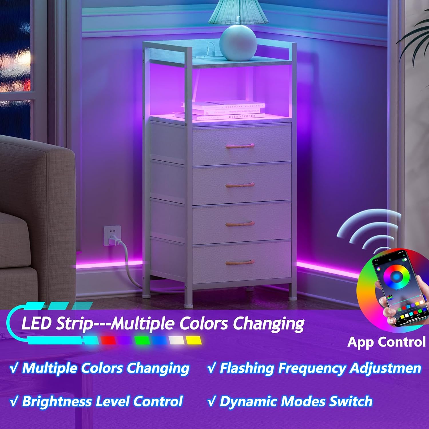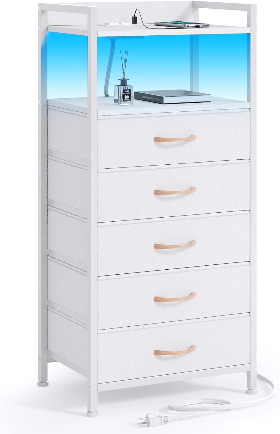 Furnulem Nightstand with 5 Storage Drawer, Tall Dresser for Bedroom with Led Light and Charging Station, Side Table Nightstand for Closet, Fabric Bins, Metal Frame, Wood Shelf