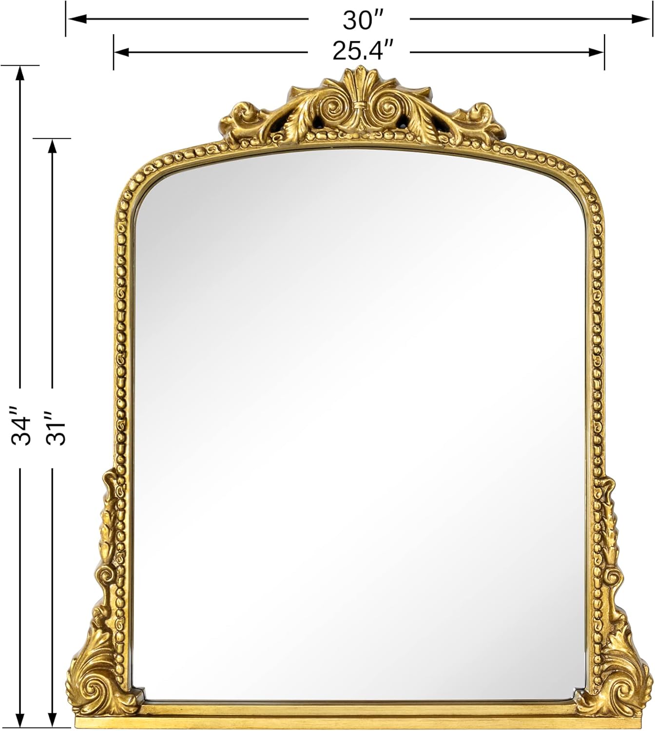Antiqued Gold Ornate Mirror Arched Mantel Wall Mirror Baroque Inspired Bathroom Vanity Rectangle Wall Mounted Mirror, 30 x 34''