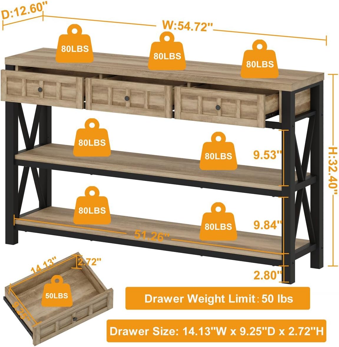 FATORRI Coffee Table and Sofa Table with Drawers for Home (Rustic Oak)