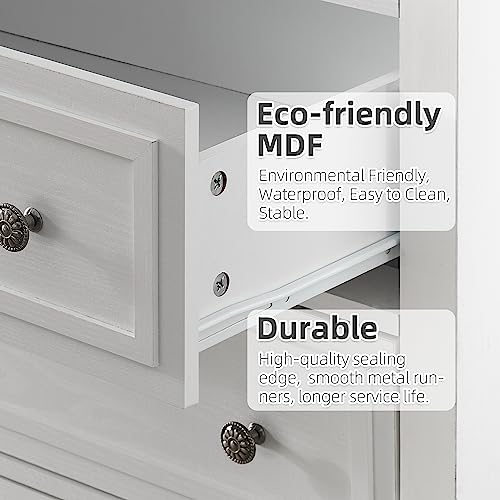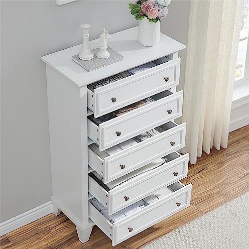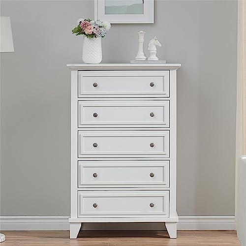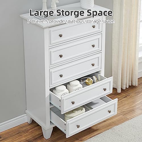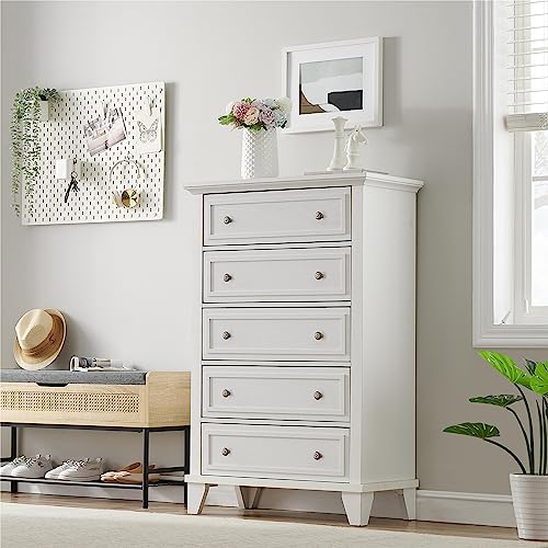 Dresser for Bedroom, Vintage Dresser with 5 Drawers, Chest Drawers with Metal Handles, Wood Organizer Storage for Living Room, Entryway, Kid's Room (Exquisite White, 5-Drawer Dresser)