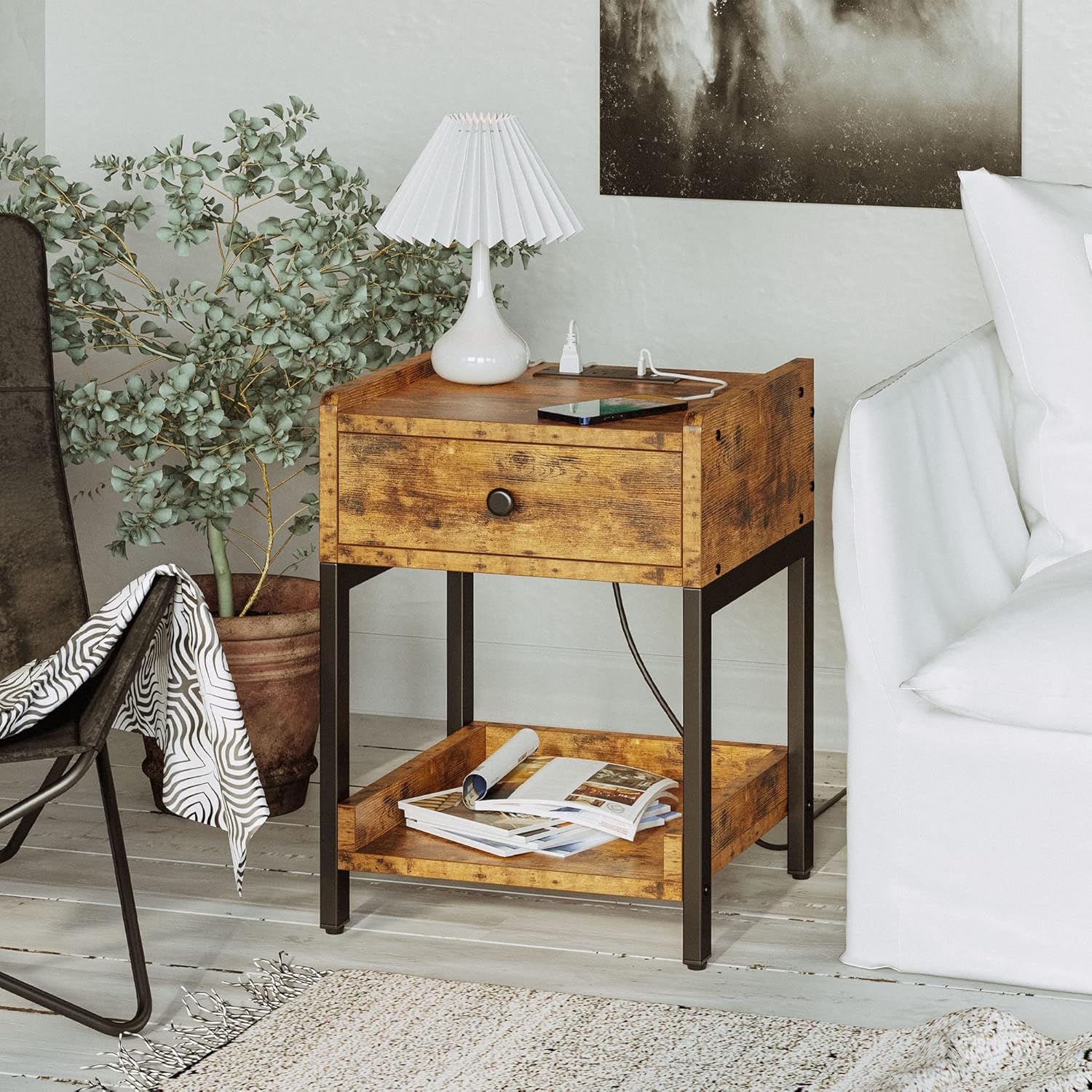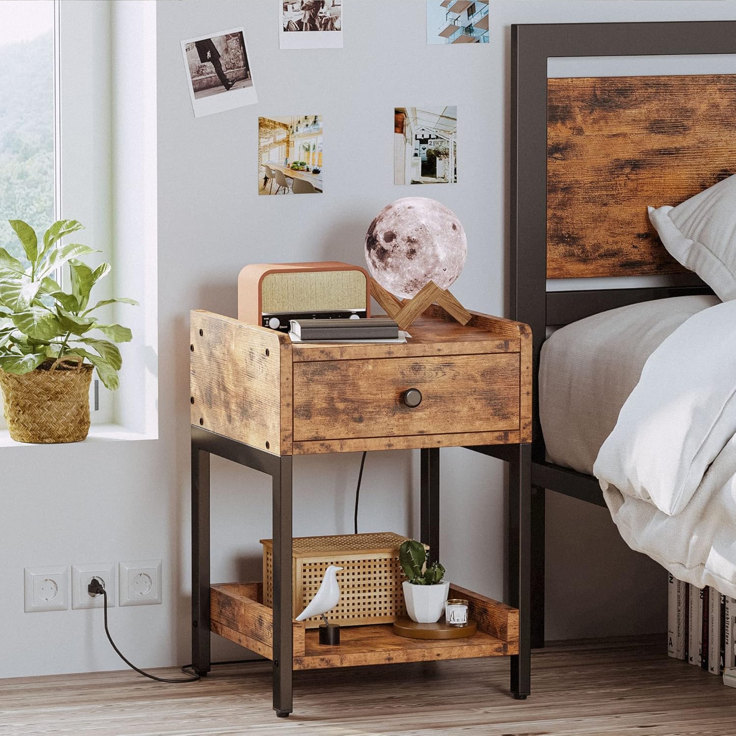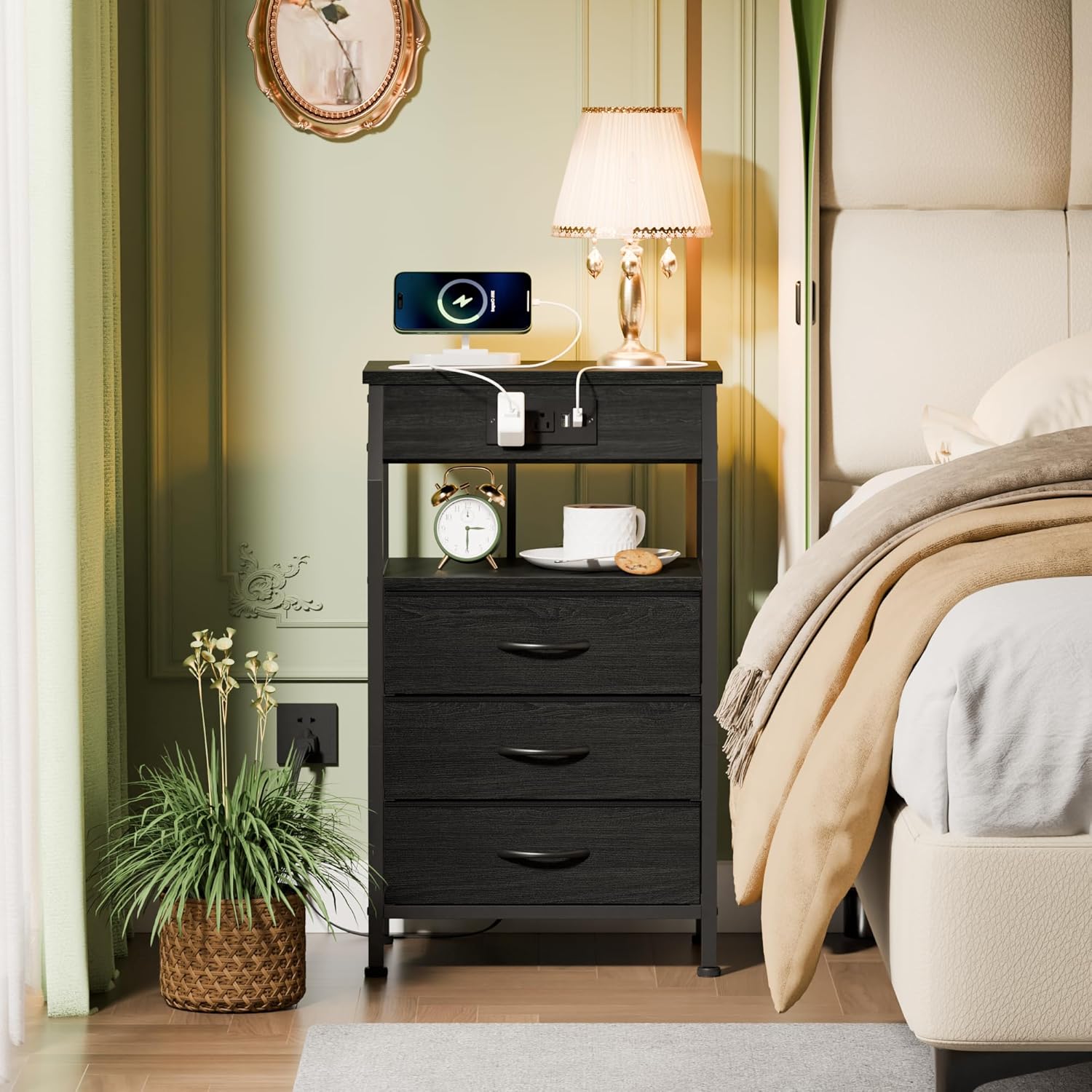 Furnulem Nightstands Set of 2, Small Nightstand with 3 Fabric Storage Drawers and 2-Tier Shelf+Night Stand with Charging Station