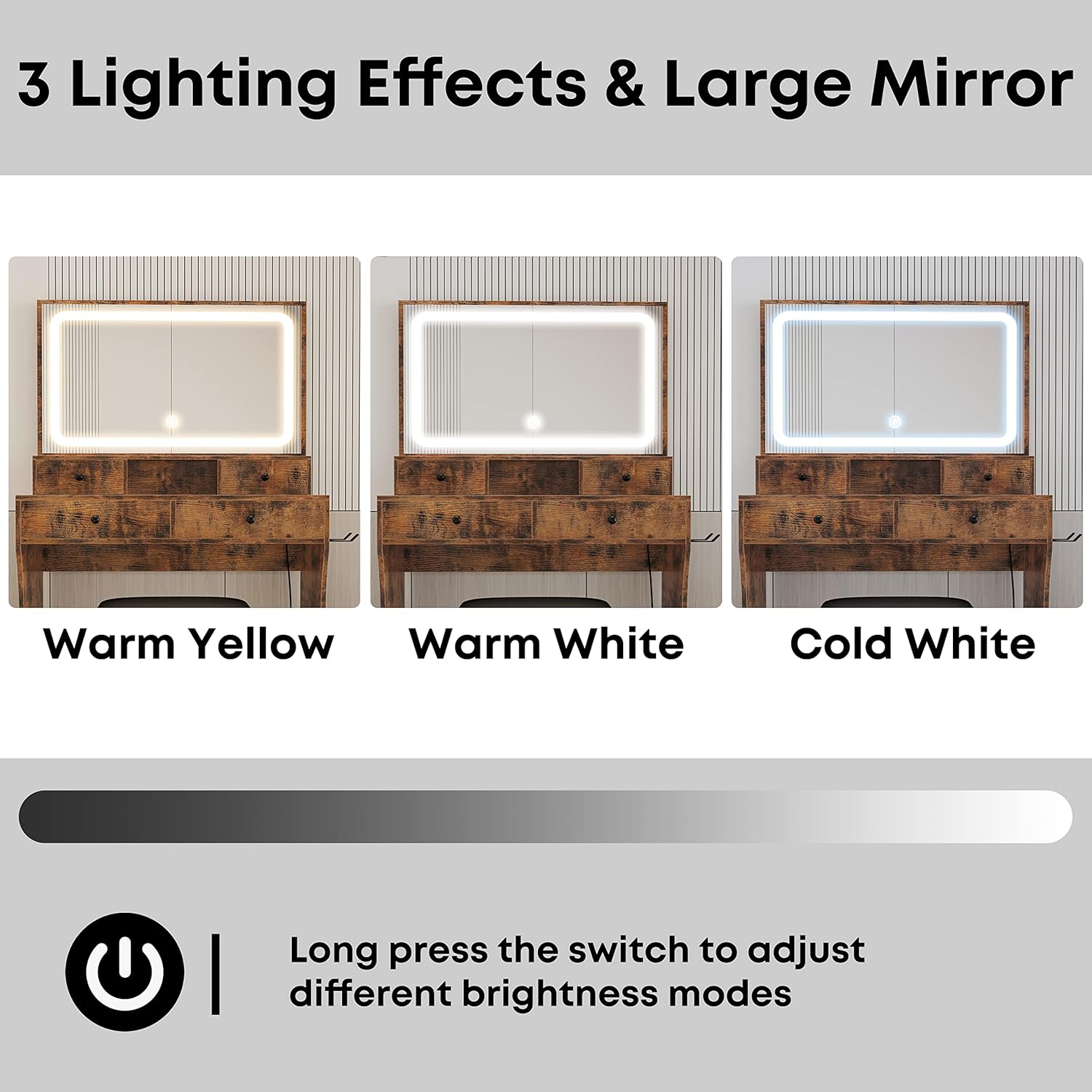 LIKIMIO Vanity Desk with LED Lighted Mirror & 4 Drawers Dressing Makeup Table Set with Storage Stool and Nightstand Bedside Table with Drawer