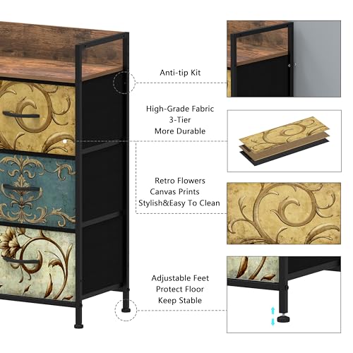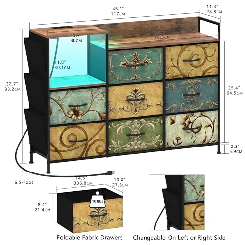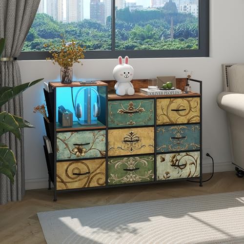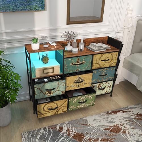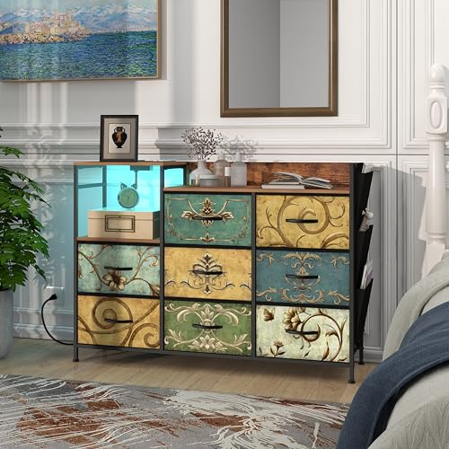 White 8 Drawers Bedroom Dresser with Power Outlets and LED Lights Side Pocket Open Shelf Long Fabric Chest of Drawers Vintage Dresser for Living Room TV Stand (Retro Flower, 8 Drawers)