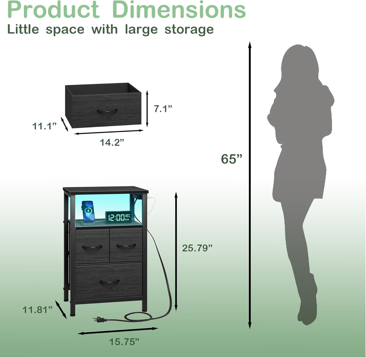 Furnulem Nightstands Set of 2, Small Nightstand with 3 Fabric Storage Drawers and 2-Tier Shelf+ Black Nightstand with Wood Shelf, Bedside Table with Led Light and Charging Station