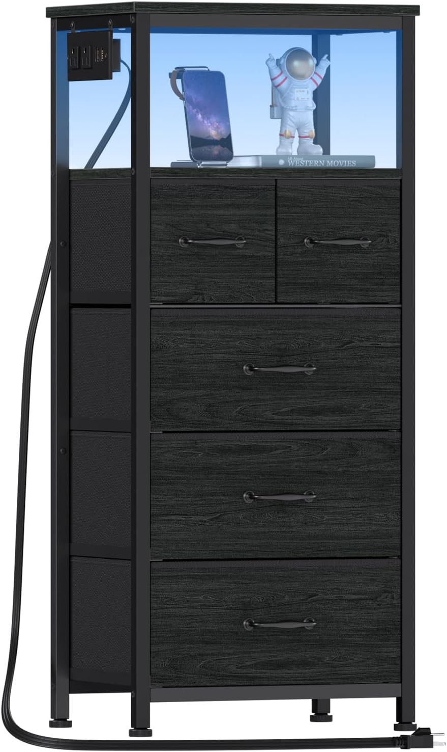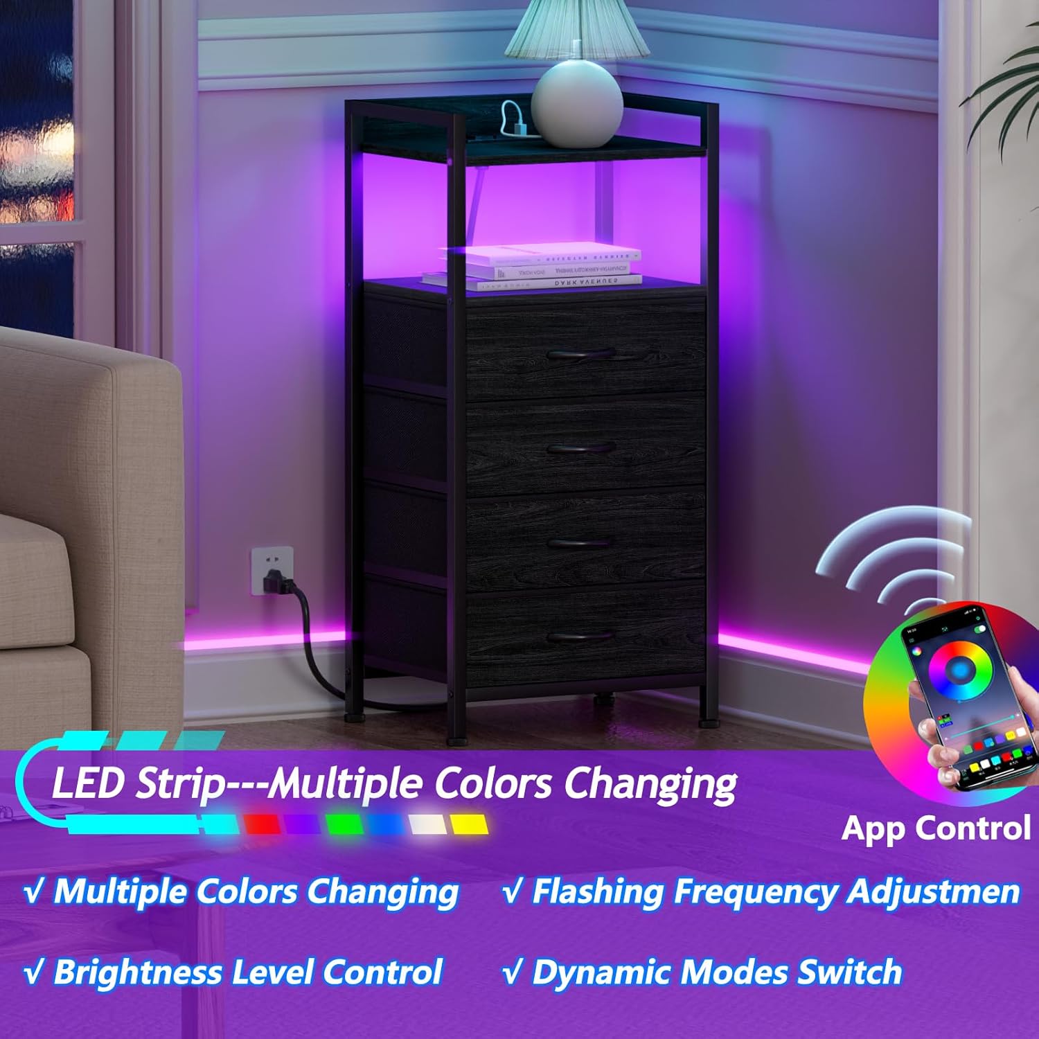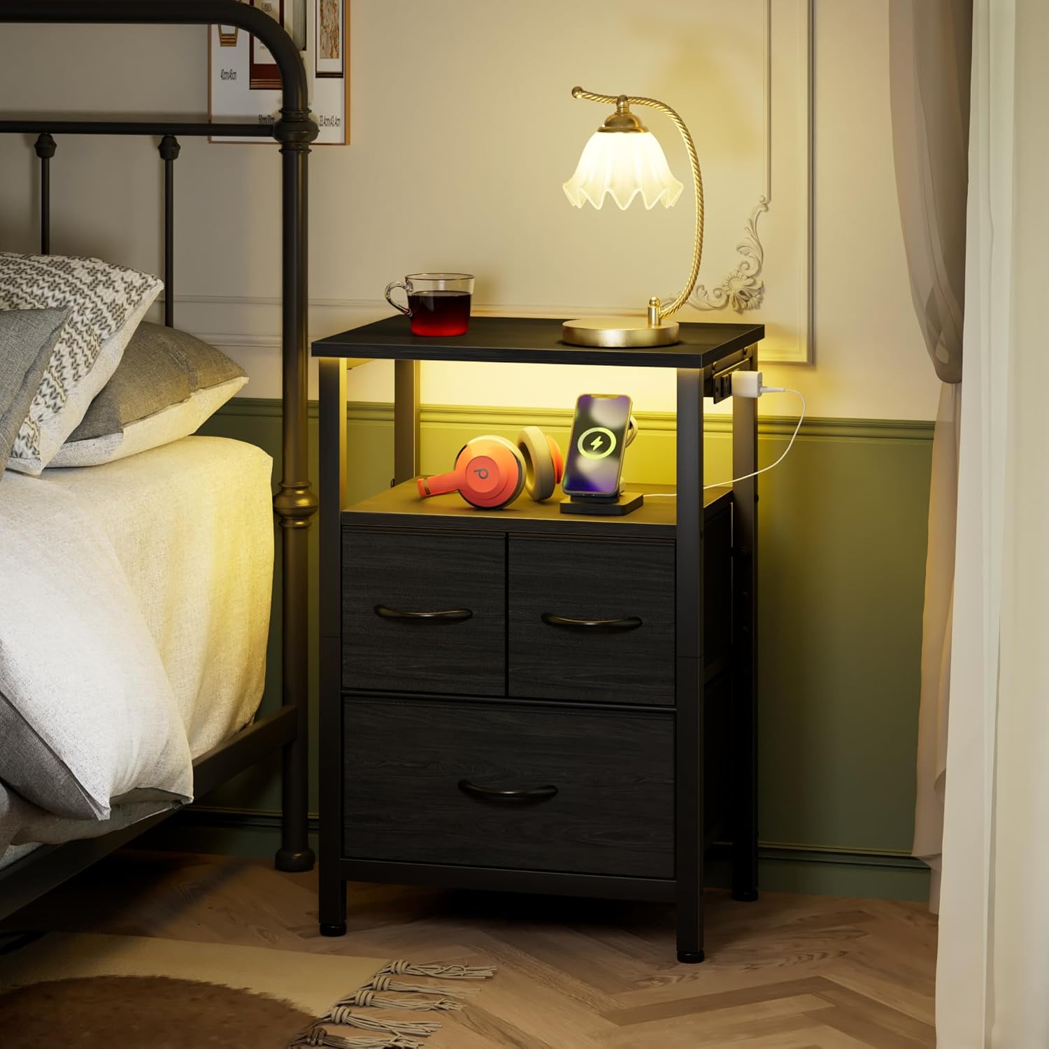 Furnulem Black Dresser for Bedroom, Small Nightstand with 3 Fabric Storage Drawers and 2-Tier Shelf, Tall Black Dresser for Bedroom with Led Light and Charging Station