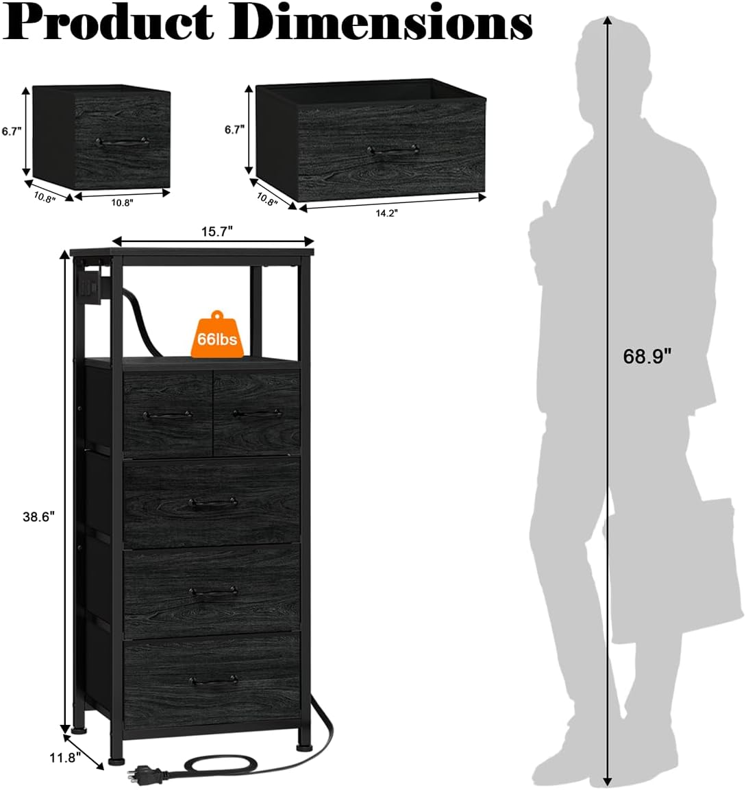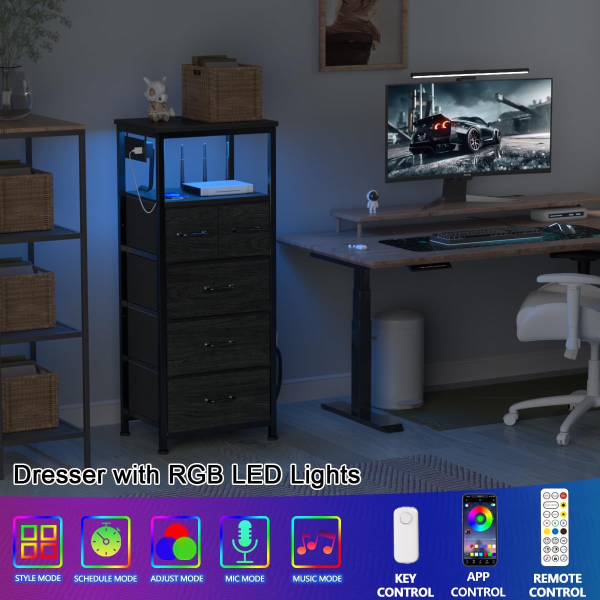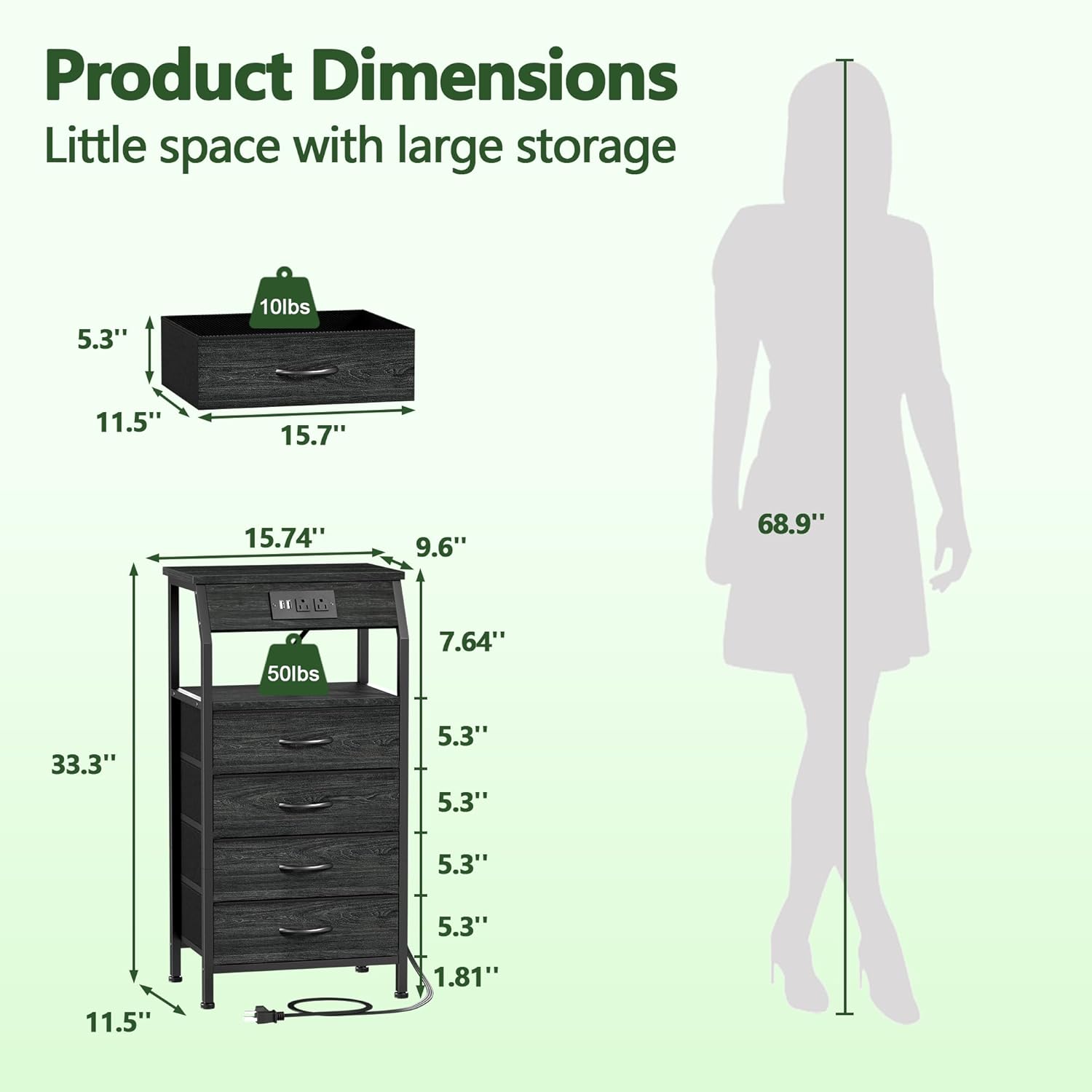 Furnulem Dresser and Nightstand Sets, 5 Drawers Dresser with Charging Station+Small Nightstand with 3 Fabric Storage Drawers