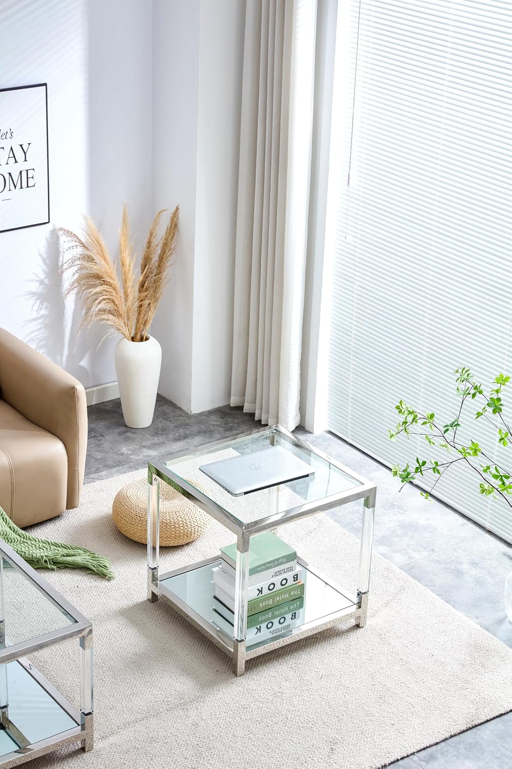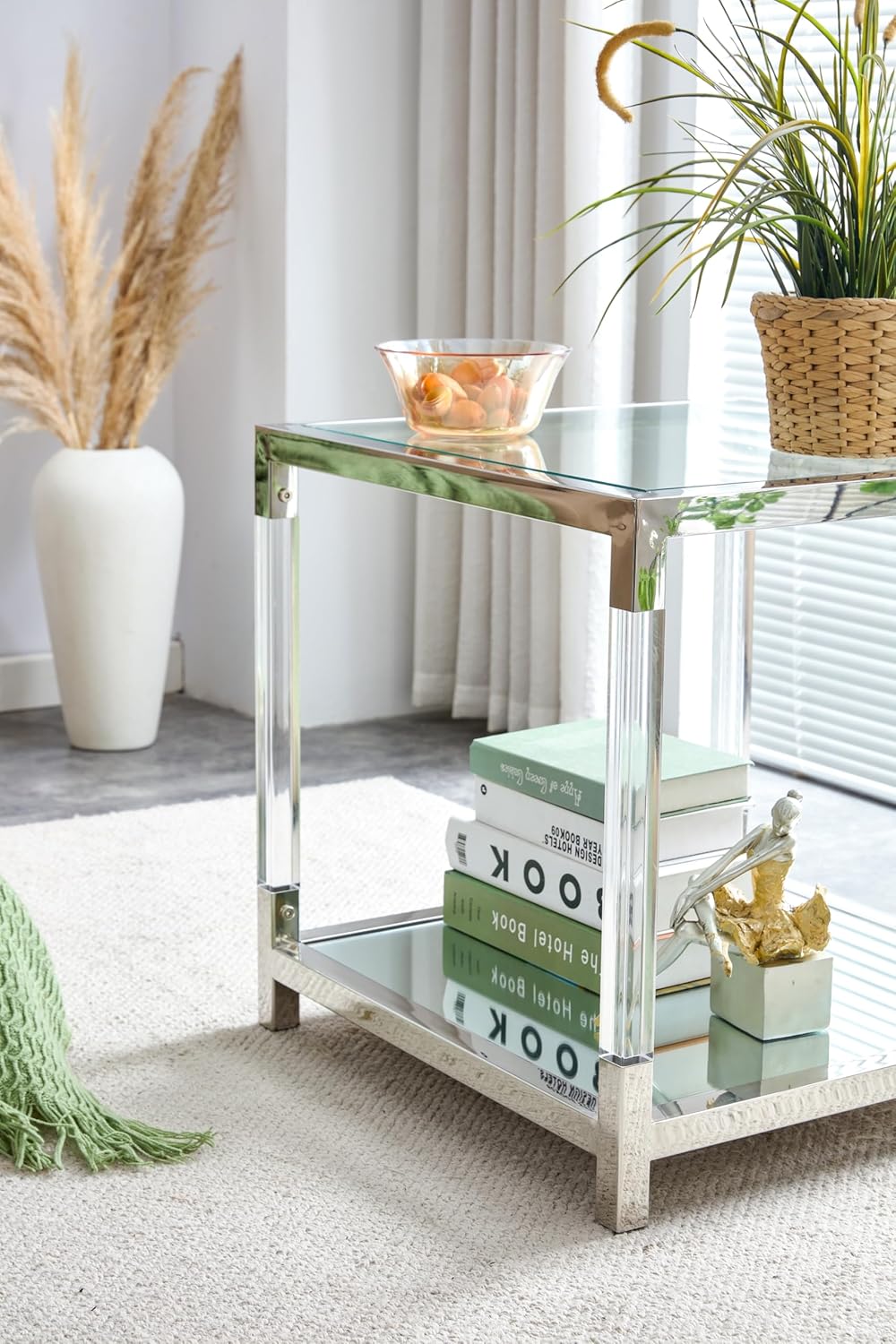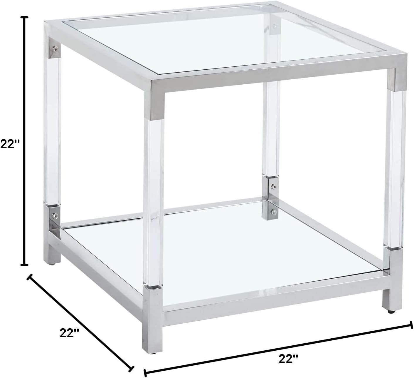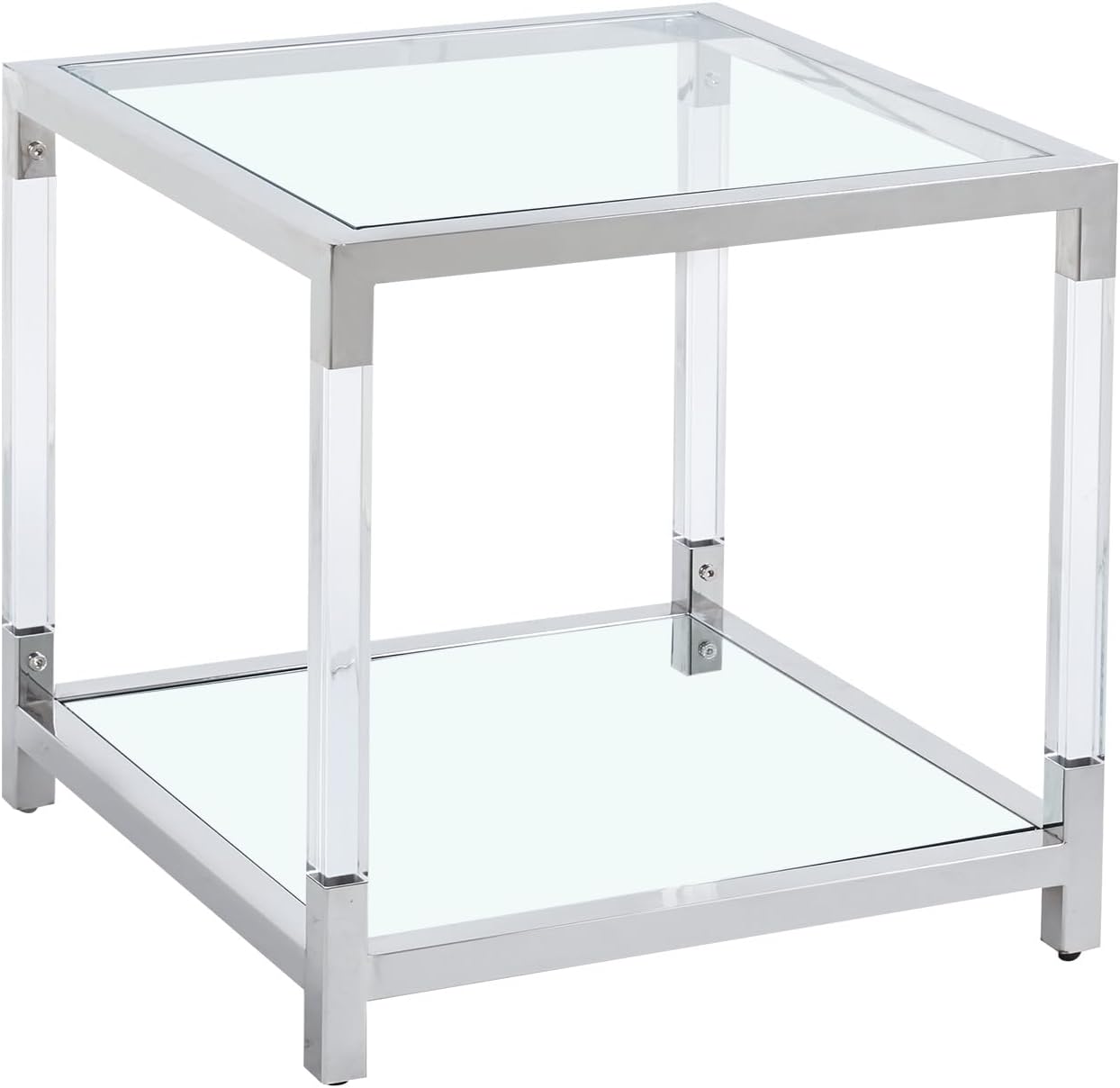 Glass End Table, 2-Tier Acrylic Sofa Side Table, Fashion Design Small Coffee Table with Silver Stainless Steel Frame, 22" W Square Bedside Table for Bedroom