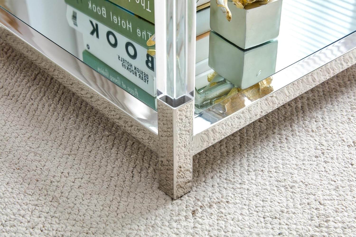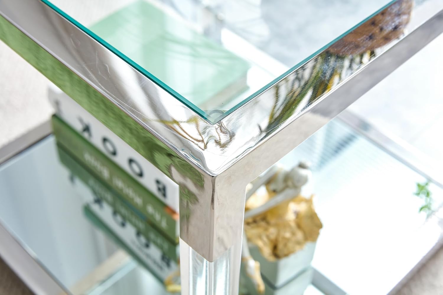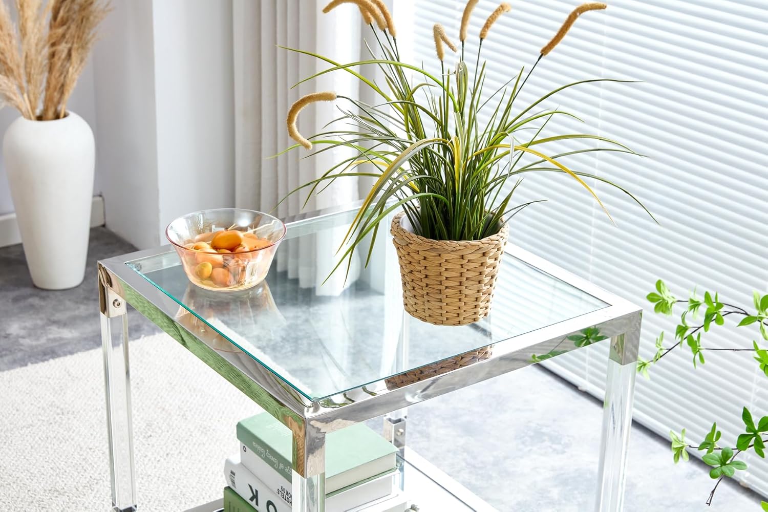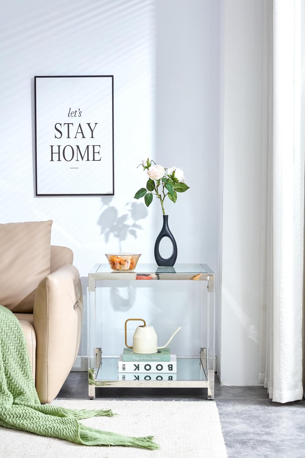 Glass End Table, 2-Tier Acrylic Sofa Side Table, Fashion Design Small Coffee Table with Silver Stainless Steel Frame, 22" W Square Bedside Table for Bedroom