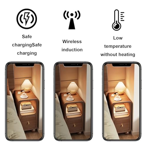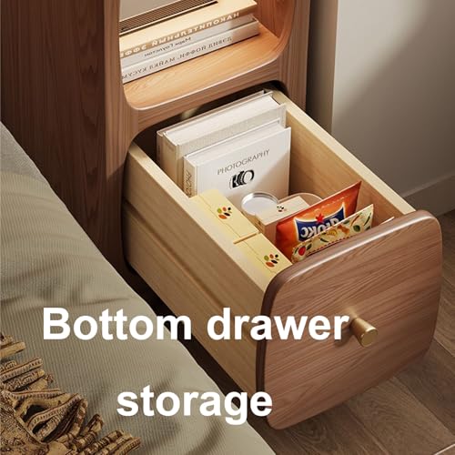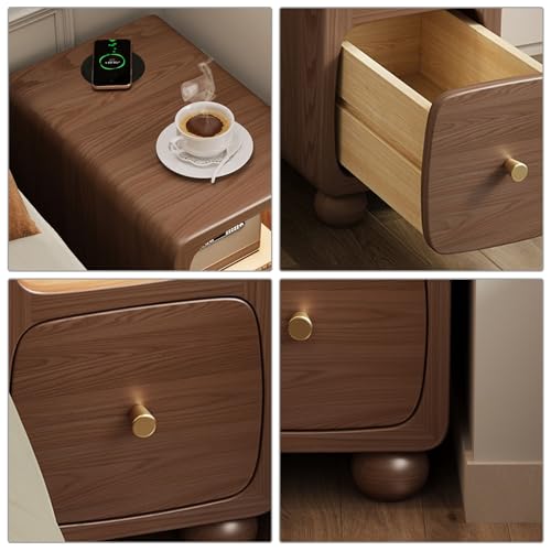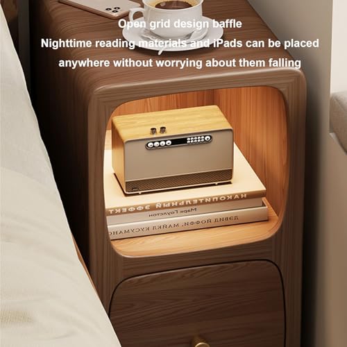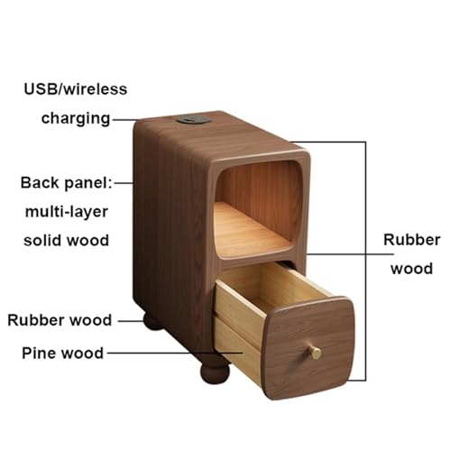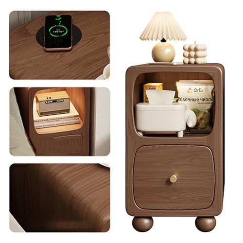 Walnut,30 * 38 * 49cm, Slim Bedside Cabinet, Narrow Solid Wood Nightstand, with Drawer & Storage Cabinet & Charging Station, for Living Room, Bedroom