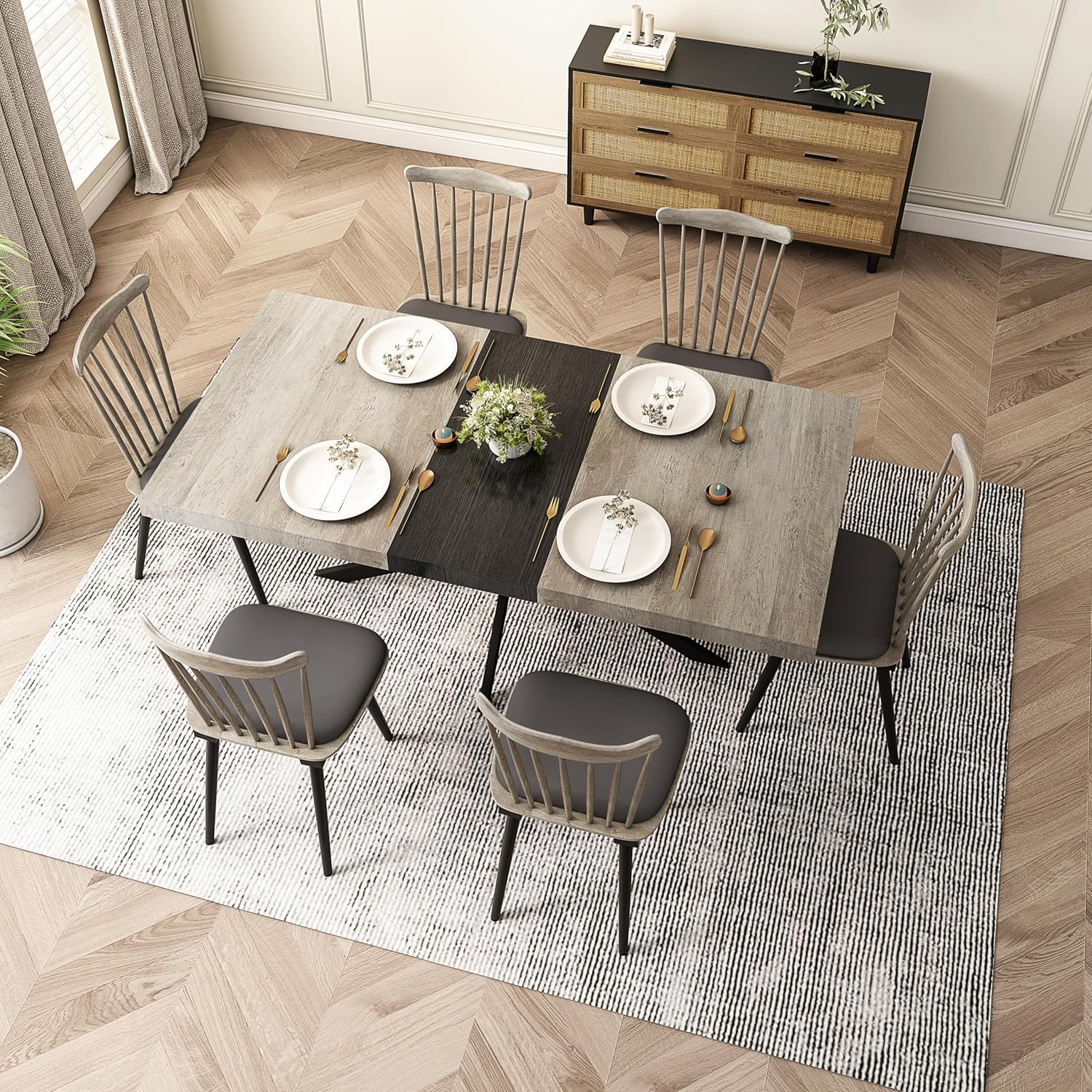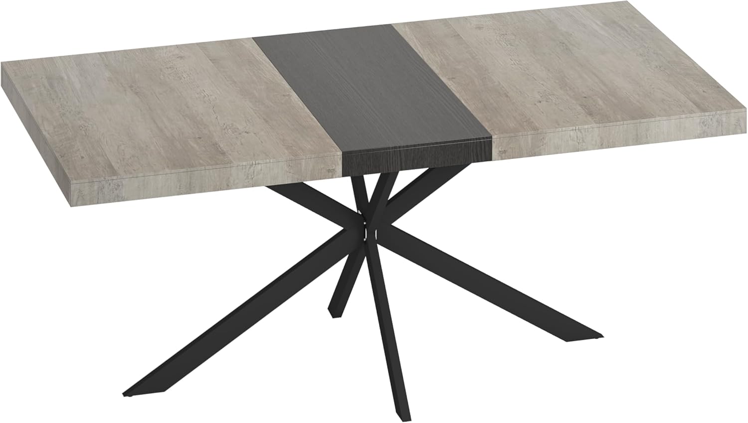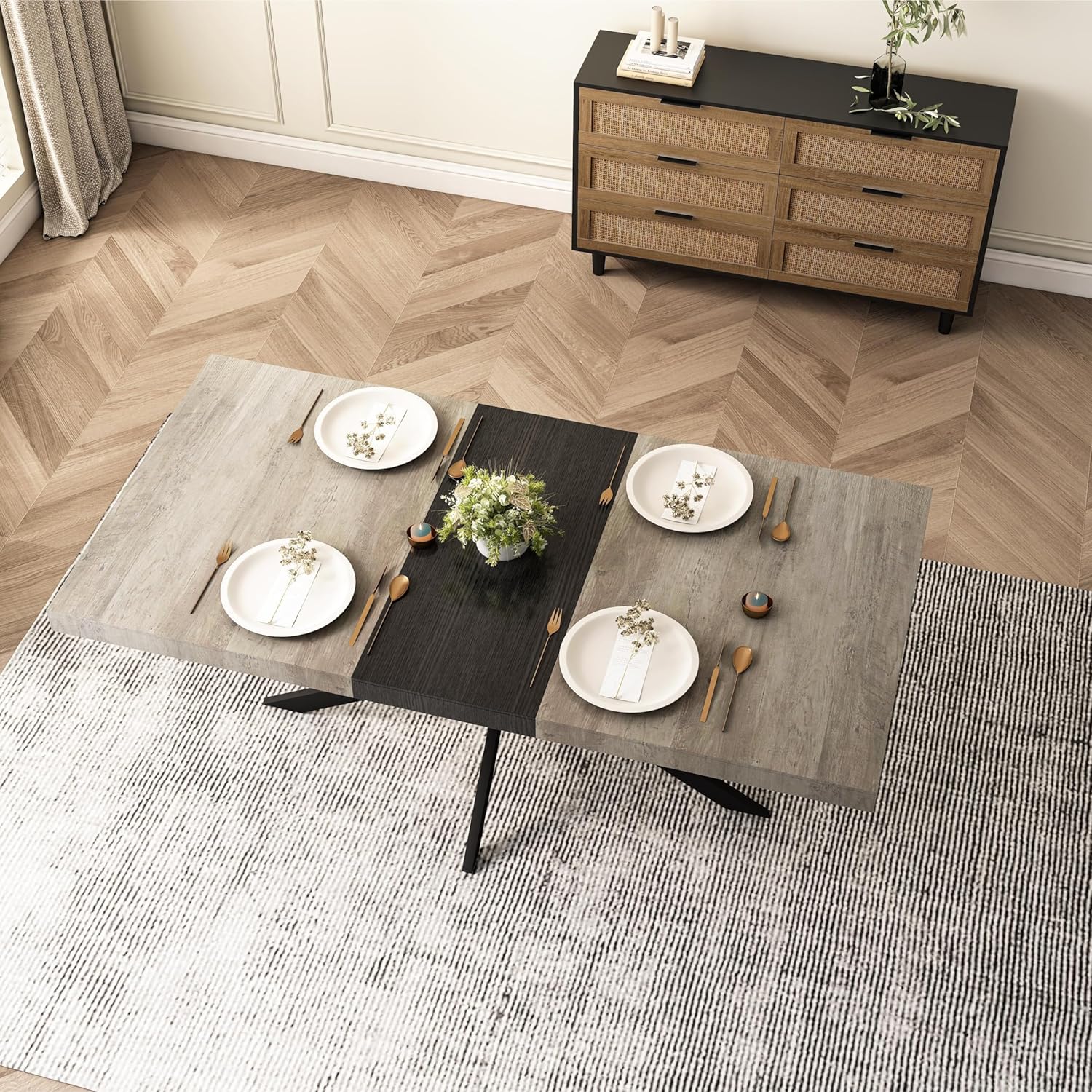 Retro Rectangular Stretch Dining Table, Grey Carole Top Embossed Center Plate, Black Fine Sand Cross Iron Foot Base DiningTable w/Storage Box, 1