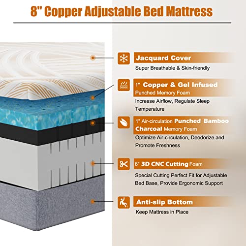 Giantex 8 Inch Twin XL Mattress, 3D Cutting Convoluted Foam Mattress for Adjustable Bed Base, Cool Gel Infused & Punched Bamboo Charcoal Memory Foam Mattress in a Box, CertiPUR-US Certified, Medium