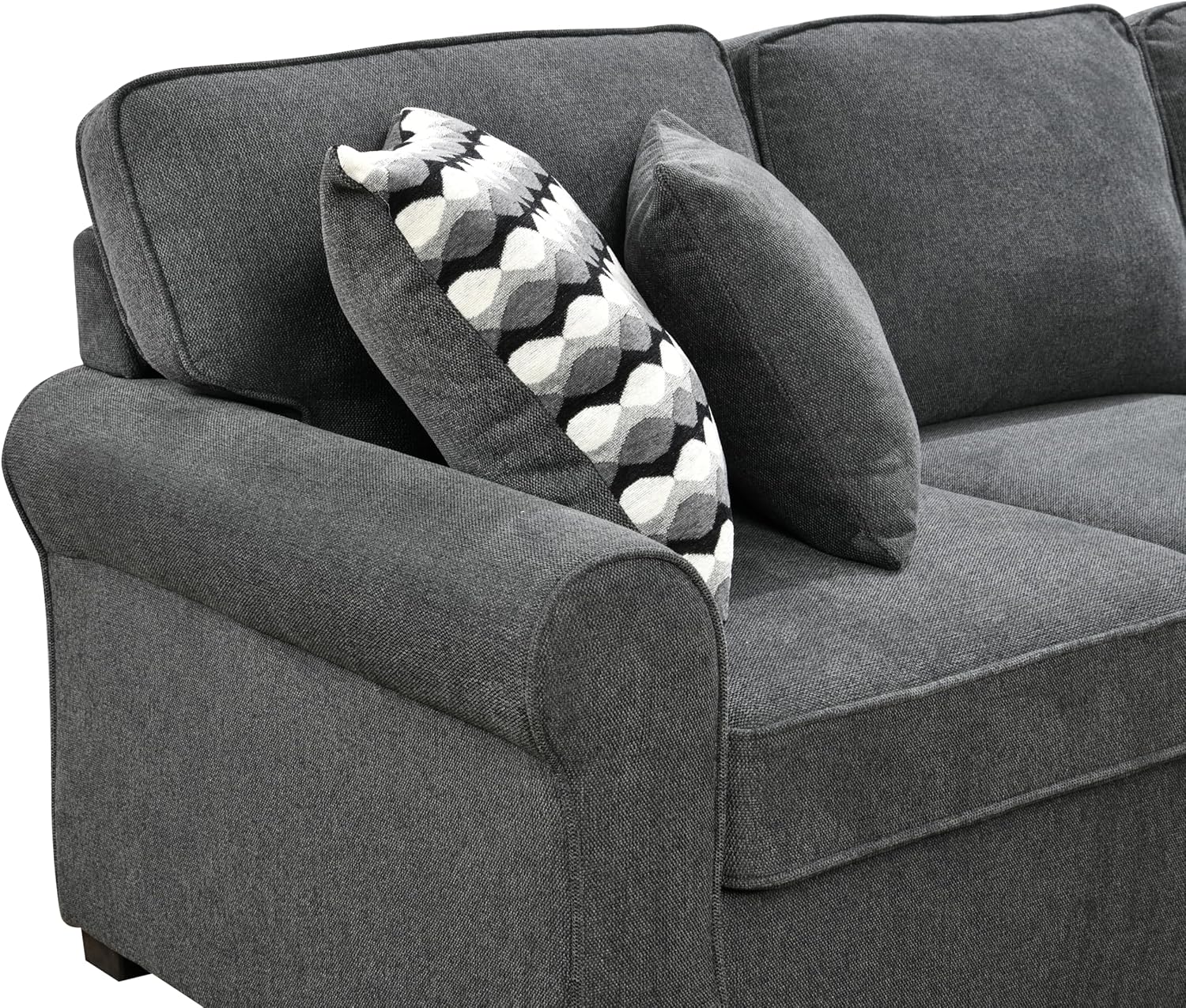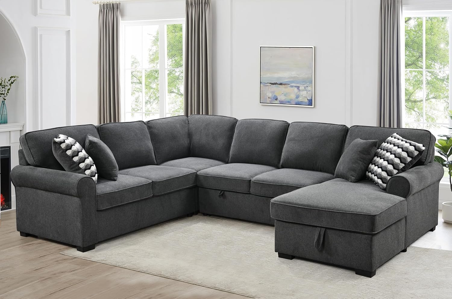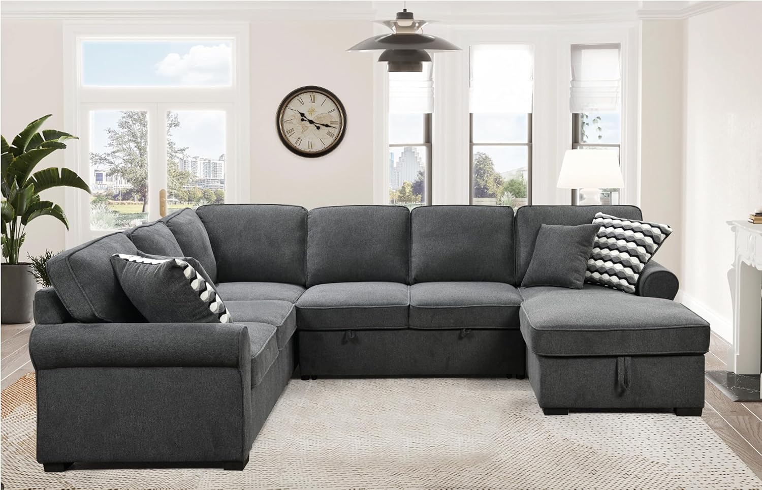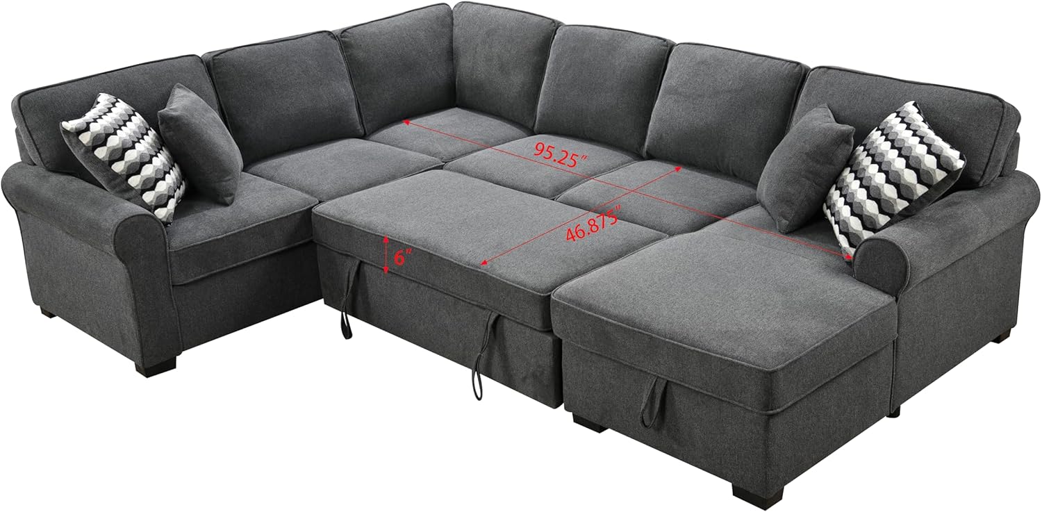 Oversized Sectional Sofa with Storage Chaise, Rolled Arms U Shaped Couch,Removable Soft Backrest Cushions,with 4 Throw Pillows for Large Space Home, Living Room,Dark Gray,117"
