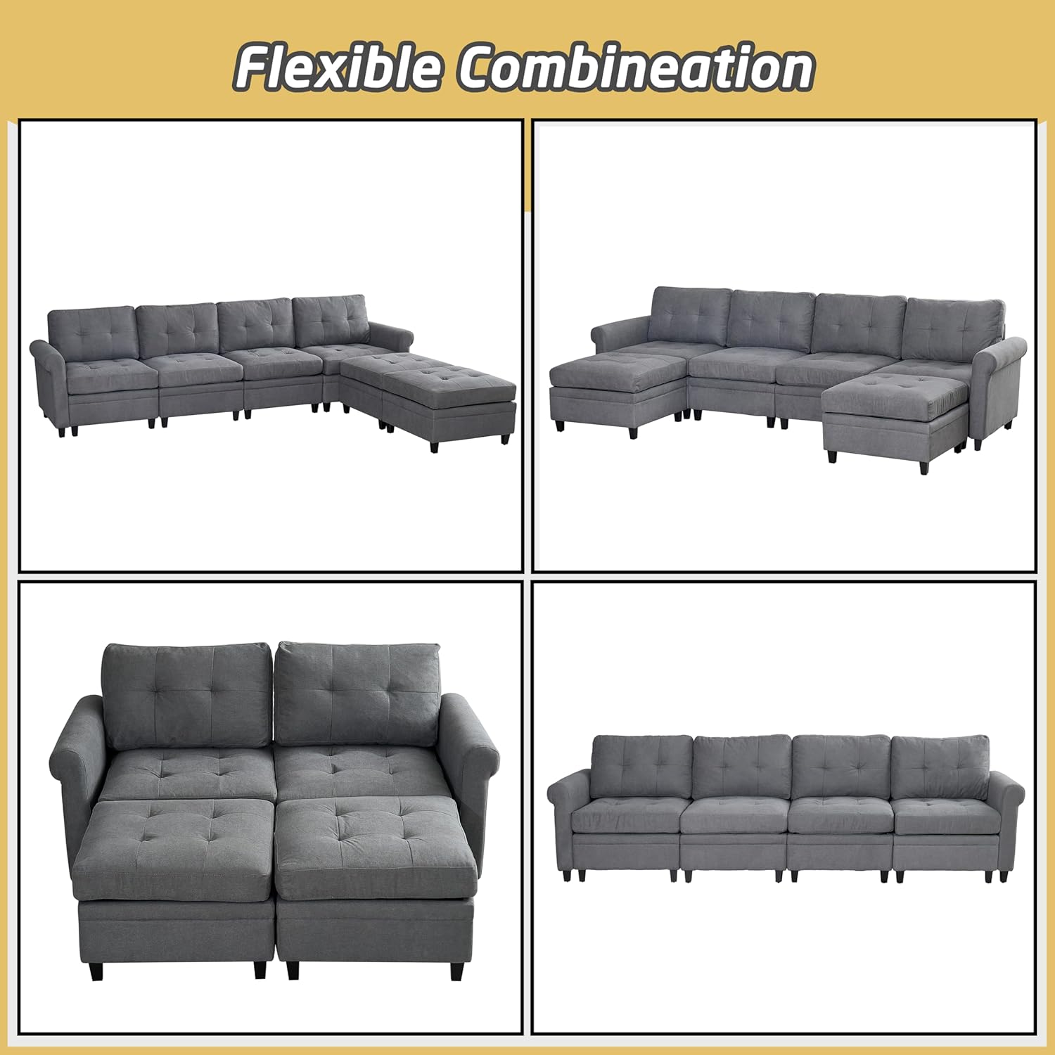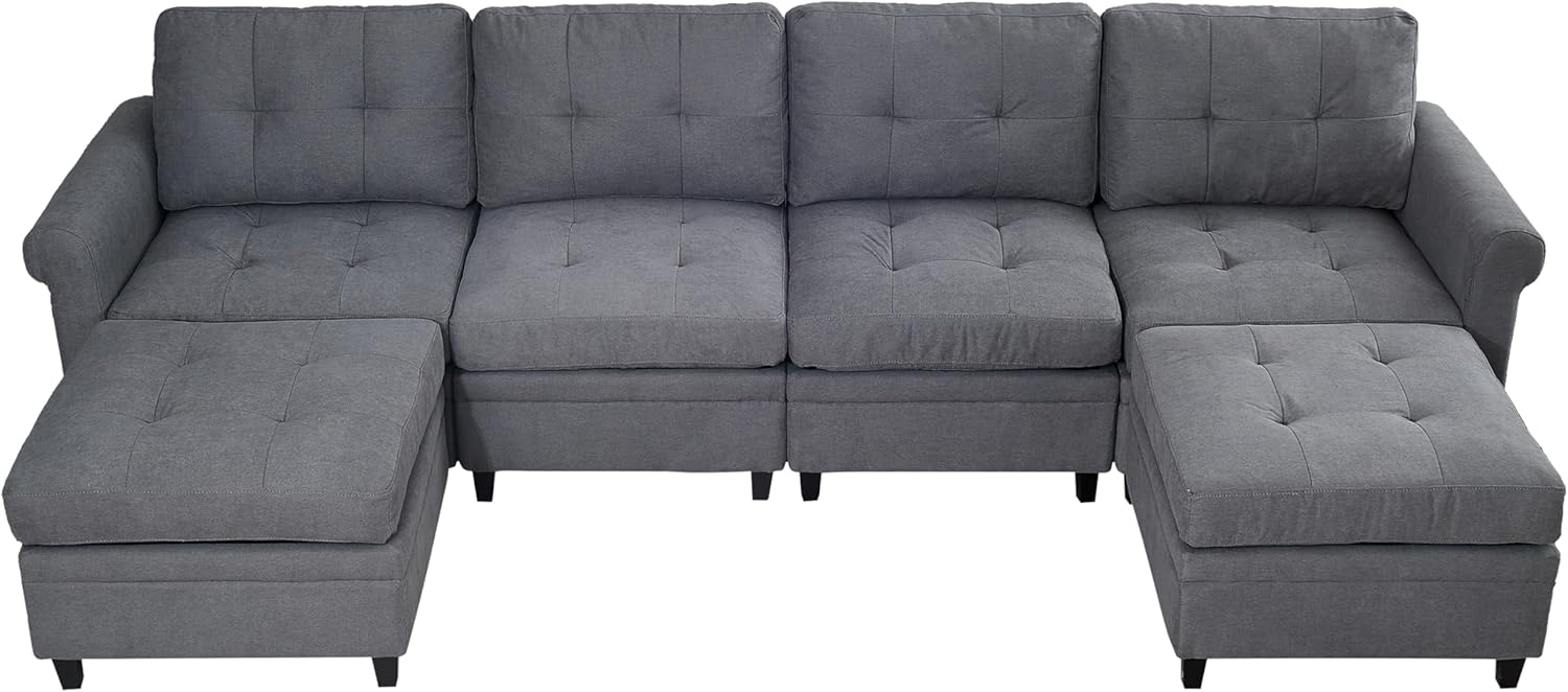 115" W Convertible Sectional Sofa with Storage Spaces, 4 Seat U-Shaped Modular Couch Set w/Double Chaise, Modern Fabric Reversible Sofa&Couches for Living Room, Apartment, Large Spaces