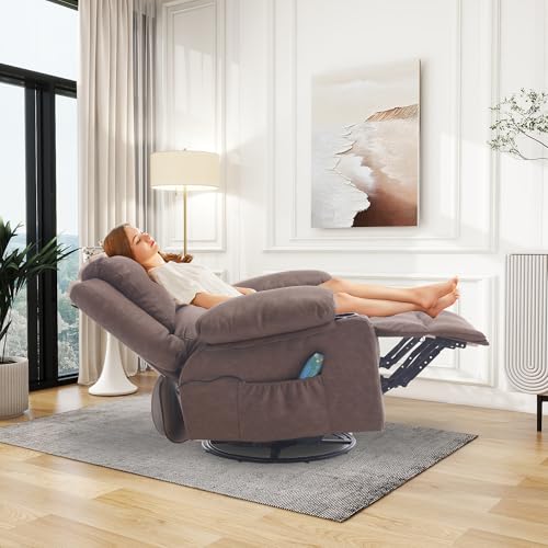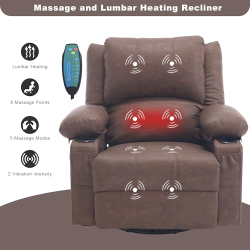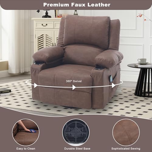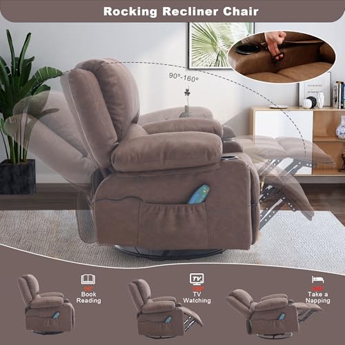 Massage Swivel Rocker Recliner with Heat, Overstuffed Faux Leather Recliners Modern Chair for Living Room, Single Sofa Rocking Chairs for Adults, Manual Lounge Recliner with Cup Holders, Beige
