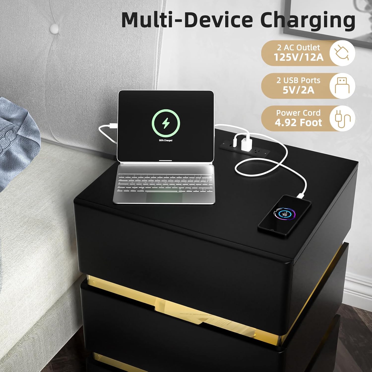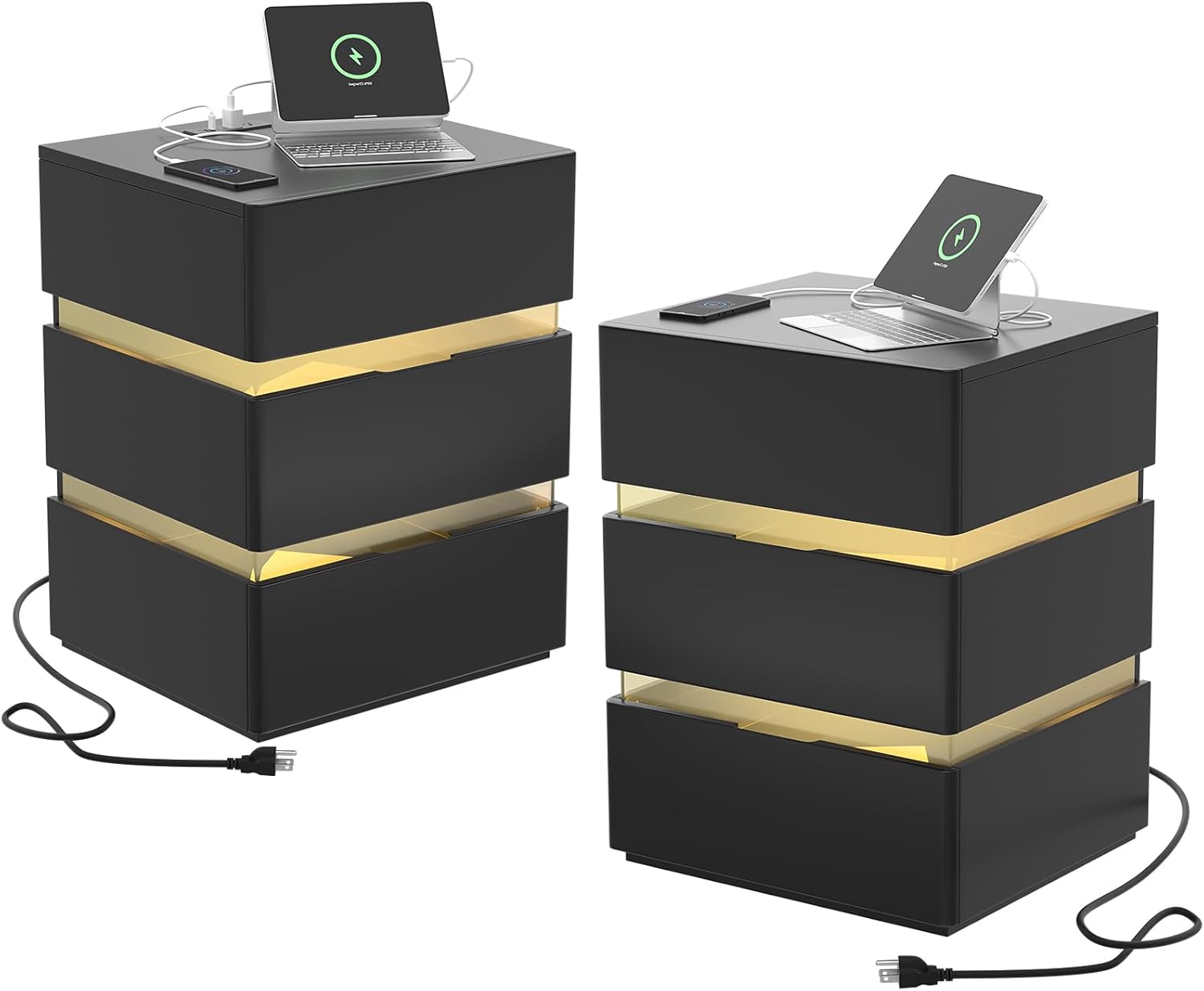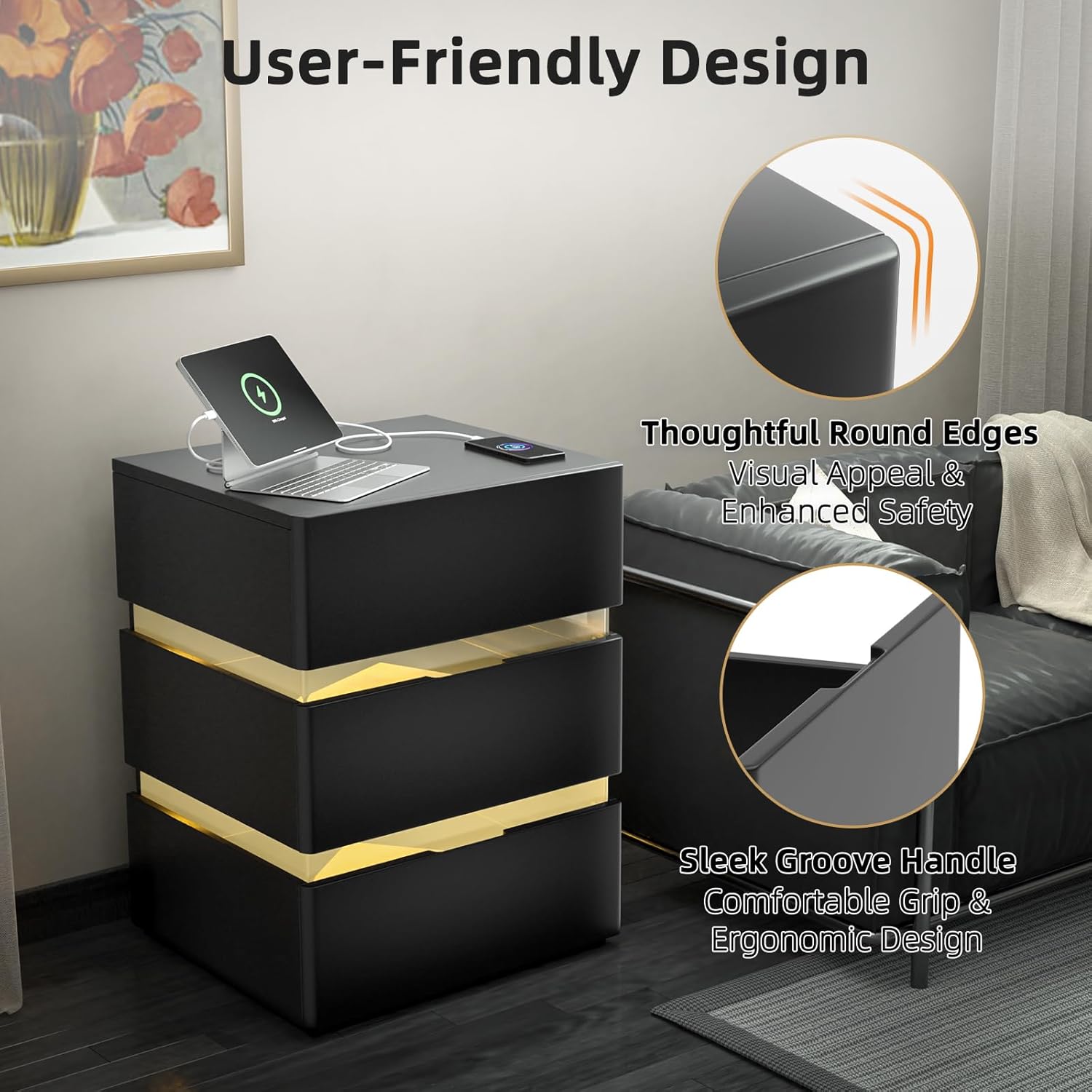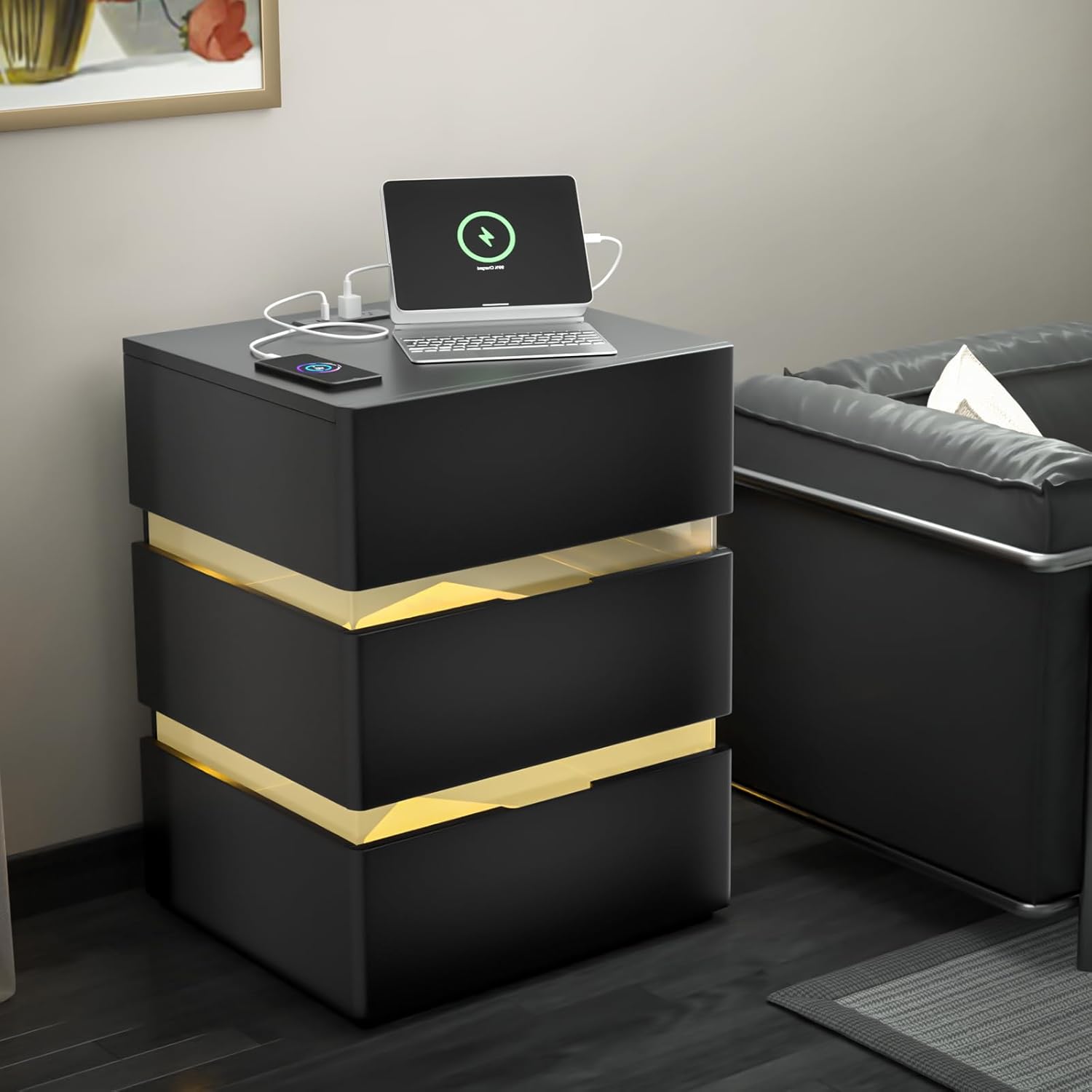 Black Nightstand with Charging Station and RGB LED Lights, Modern End Side Table with 3 Drawers, Wooden Cabinet Stand by Sofa, Bedside Tables for Bedroom,Bedside Tables 16.97" L x 15" W x 23.33" H