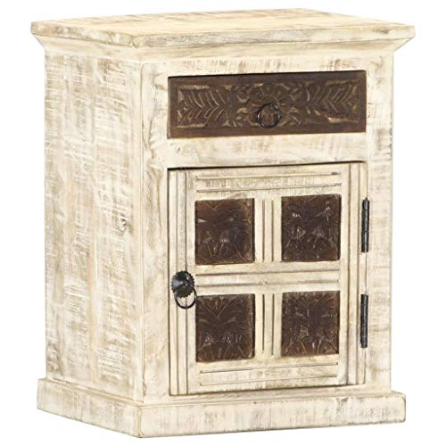 Bedside Cabinet White 15.7"x11.8"x19.7" Solid Mango Wood,Vintage Wooden Bedside Table with Carved Pattern White