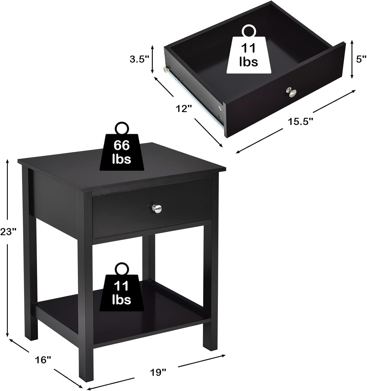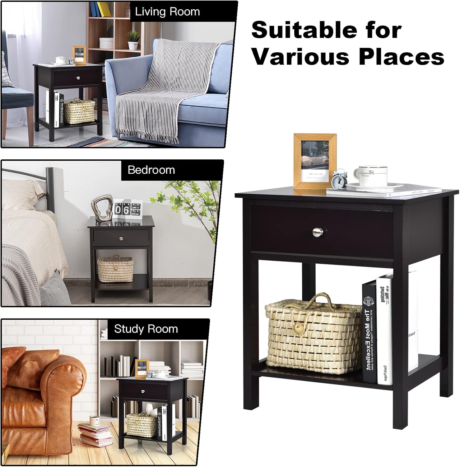 COSTWAY Nightstand with Drawer Storage Shelf Wooden Bedside Sofa Side Table Black