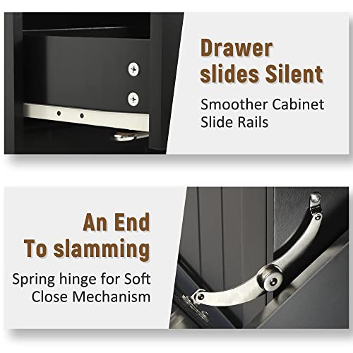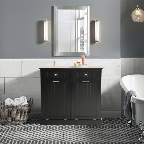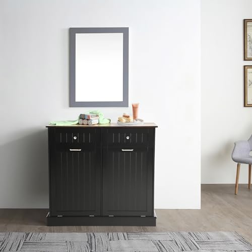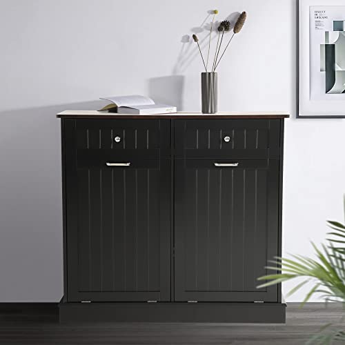 Tilt Out Trash Can Cabinet with Double Hidden Trash Can Holder, Kitchen Free Standing Recycling Cabinet,Dog Proof Trash Can,Wood (Teal)