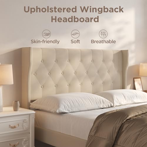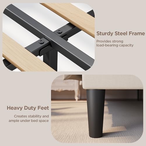 Aiho Queen Size Bed Frame with Headboard, Upholstered Bed Frame with Solid Wooden Slats, Under Bed Storage, No Box Spring Needed, Noise-Free, Easy Assembly, Beige