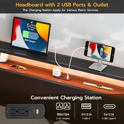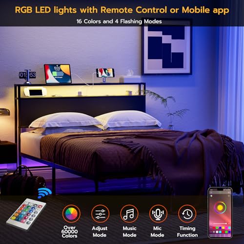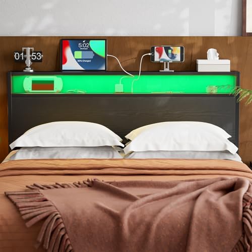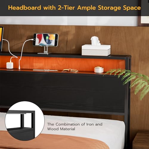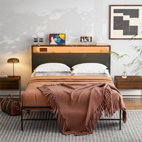 Full Size LED Headboard with Storage Shelf,Rustic Brown Headboards Only with Outlets,USB & Type C Port,Metal and Wood Frame