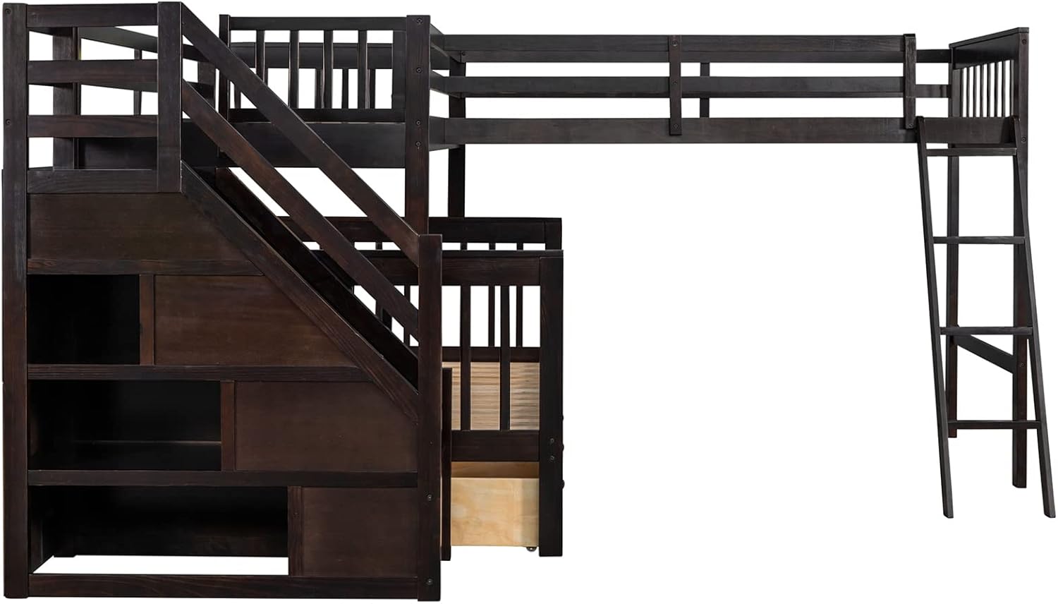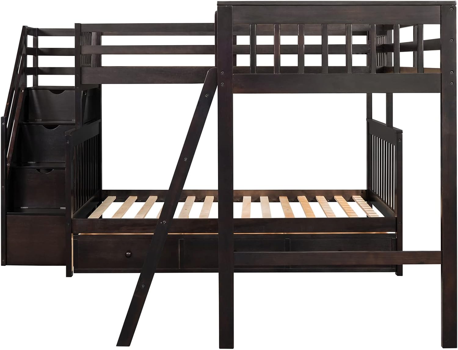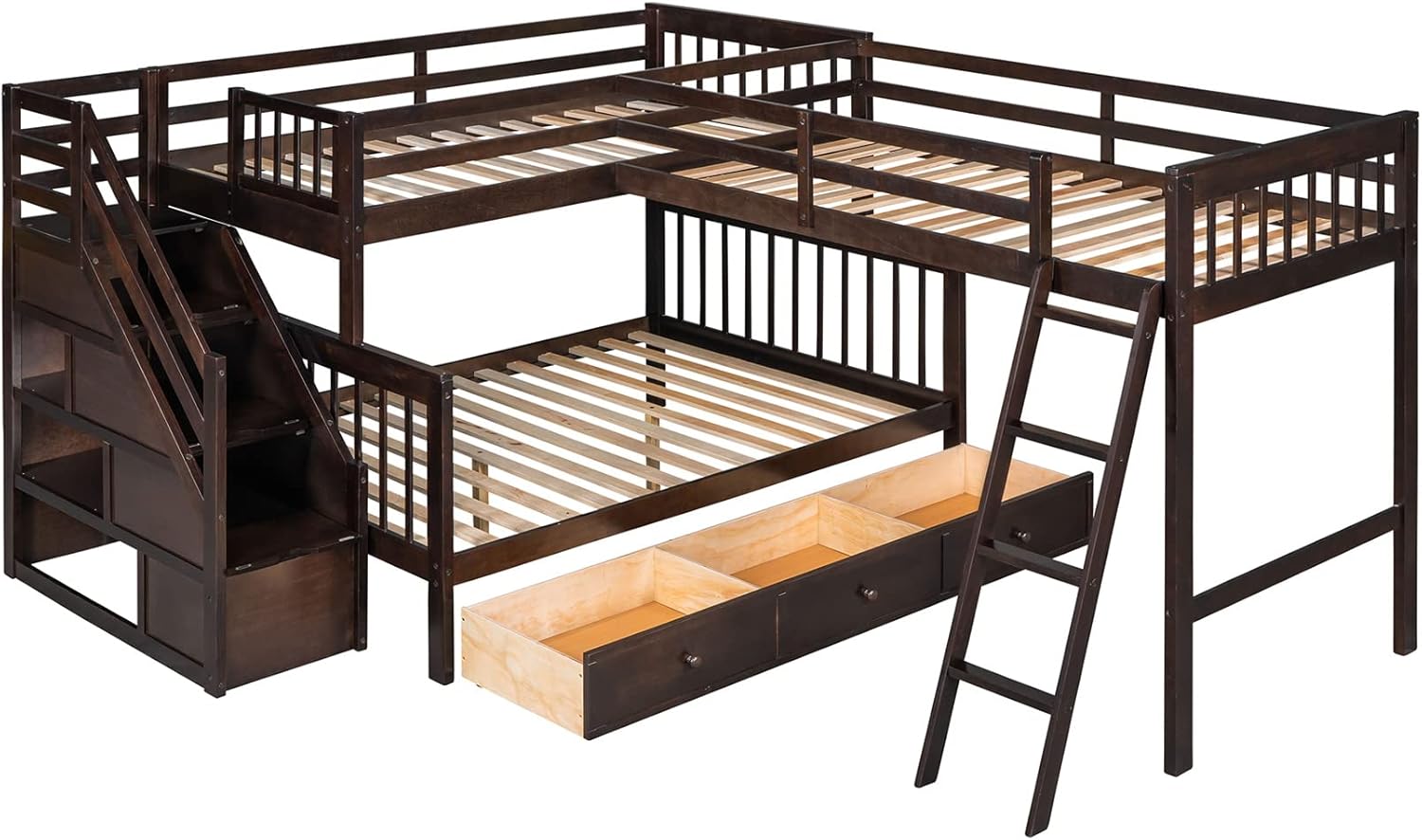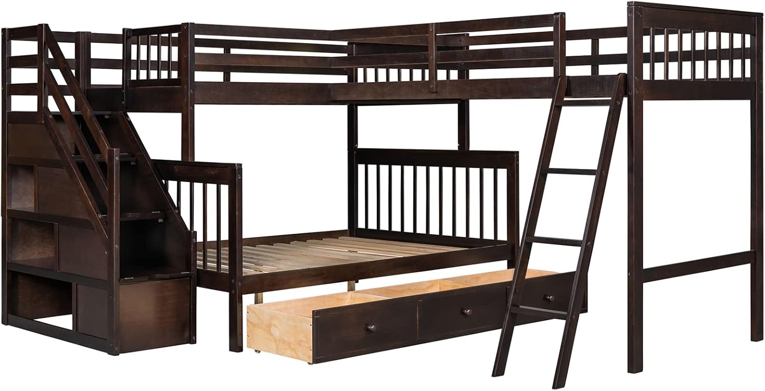Bellemave L-Shape Triple Bunk Beds with Stairs and Storage Drawers Twin Over Full Bunk Bed Attached a Loft Bed with Drawers Wood Corner Bunked for 3 Kids Boys Girls Teens, Espresso
