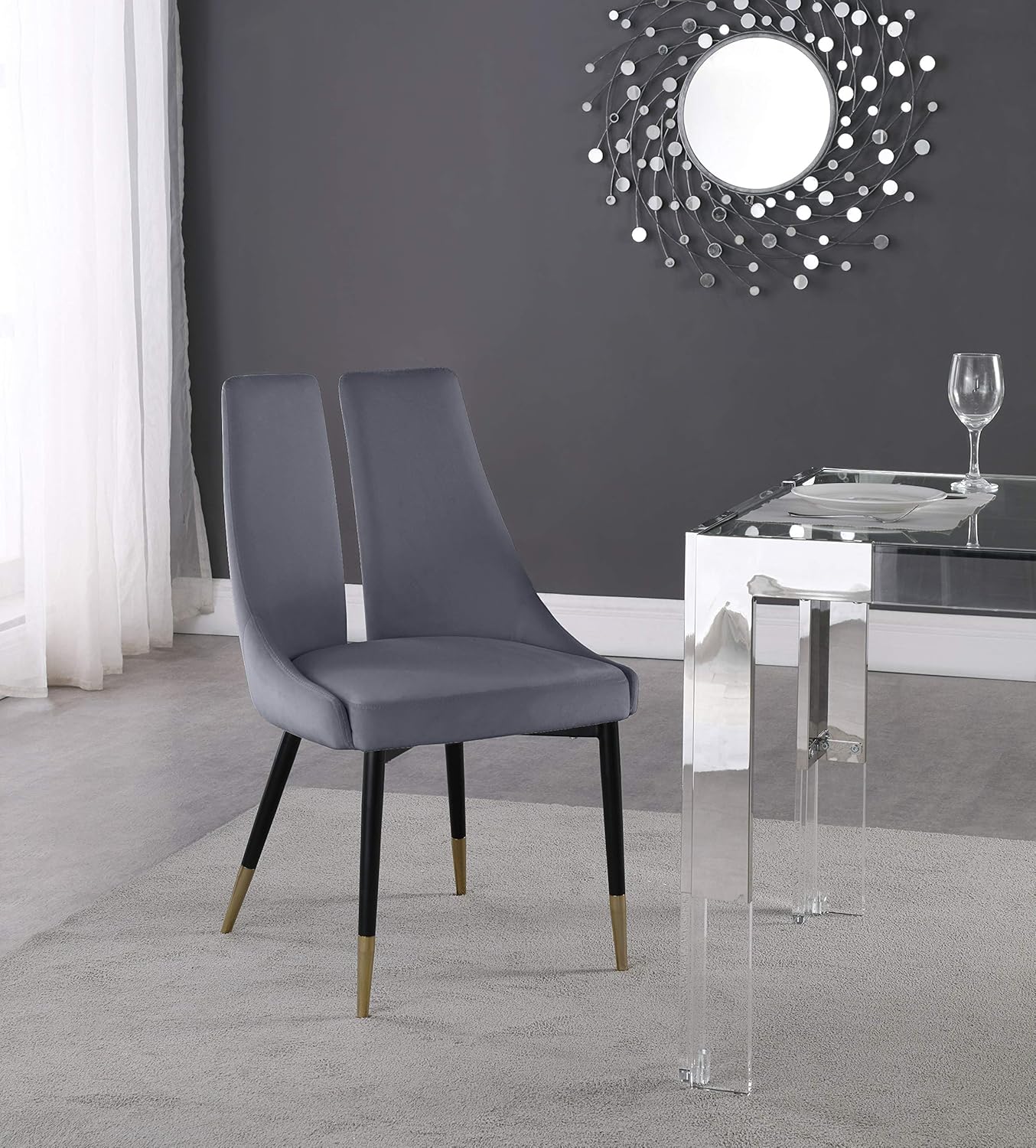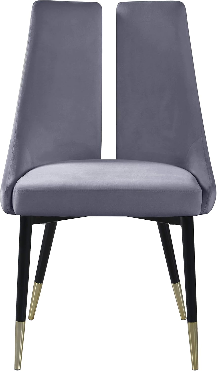 Meridian Furniture 944Grey-C Sleek Collection Modern | Contemporary Velvet Upholstered Unique Dining Chair with Gold Tipped, Matte Black Iron Legs, Set of 2, 22" W x 24.5" D x 35.5" H, Grey
