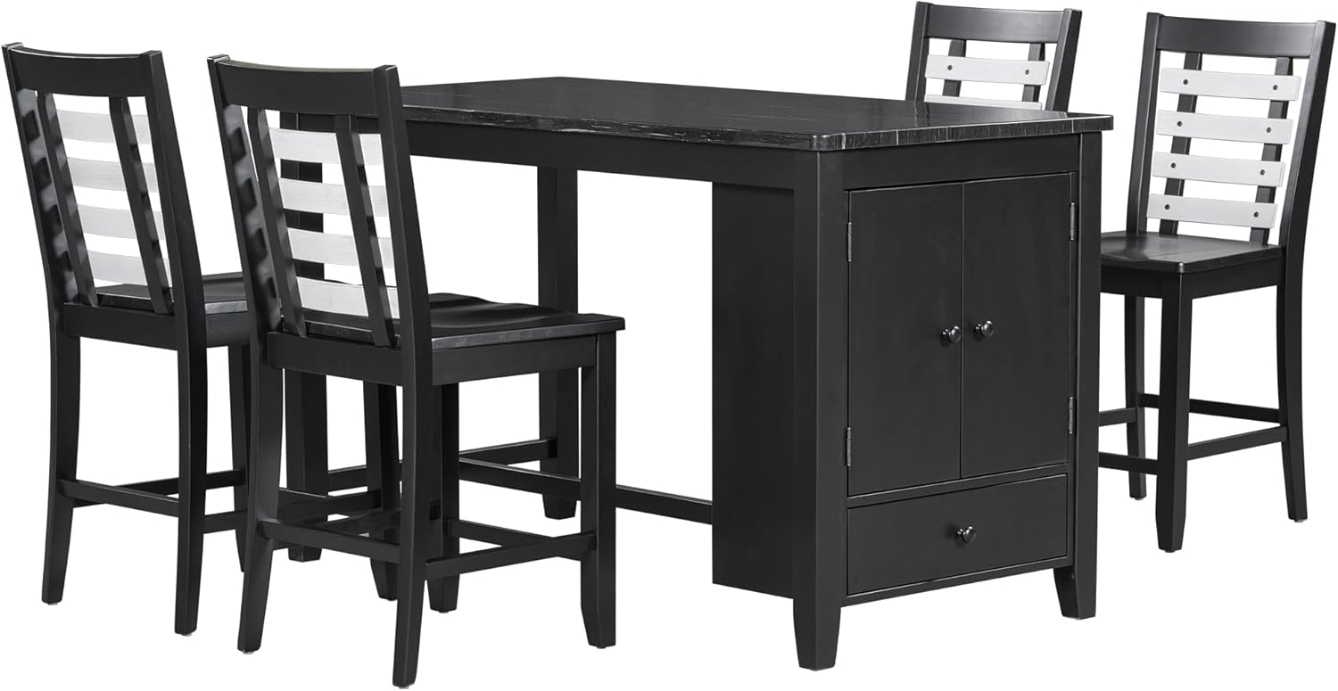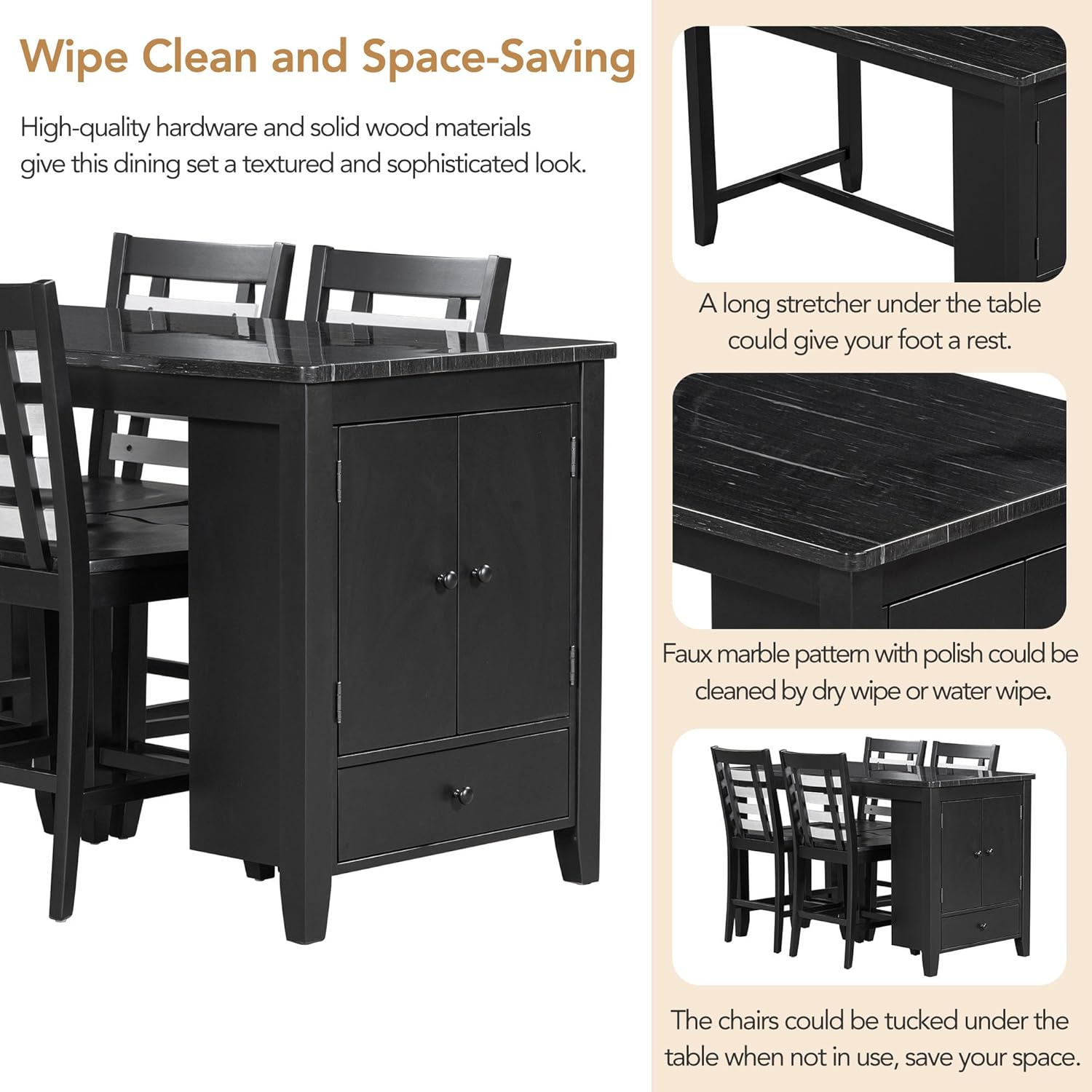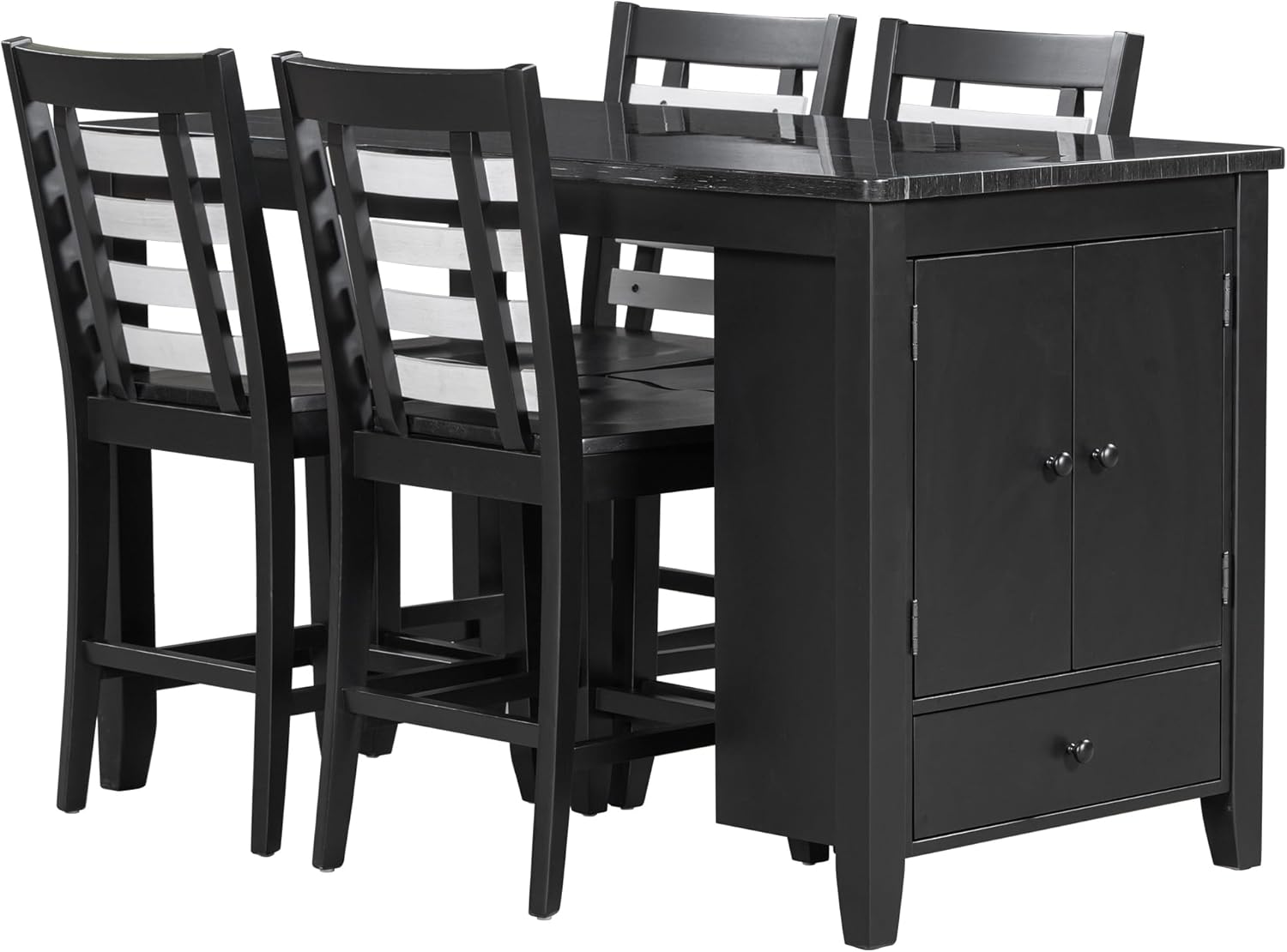 5-Piece Counter Height Wood Dining Table Set with Faux Marble Tabletop, Storage Cabinet and Drawer & 4 Matching Chairs, Black