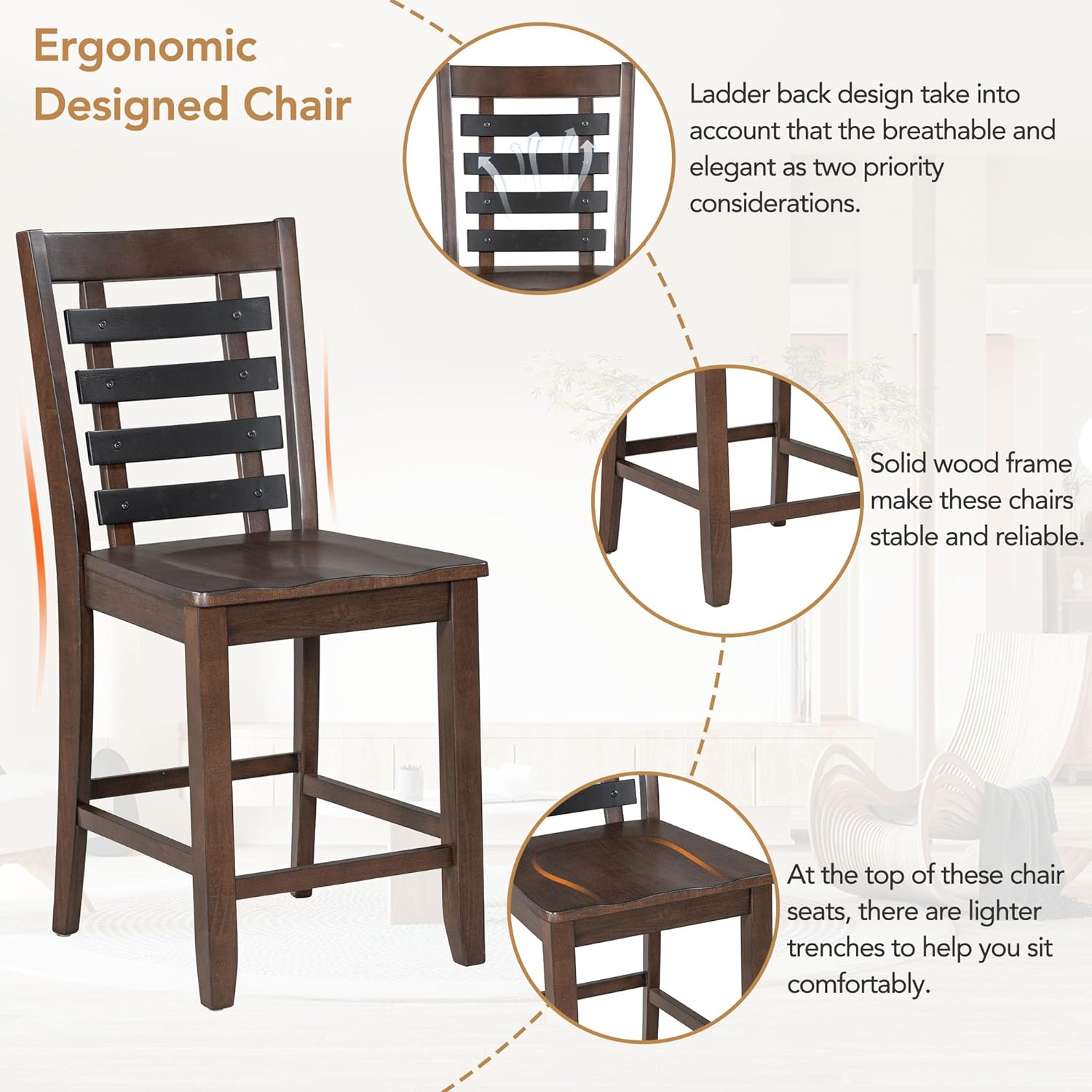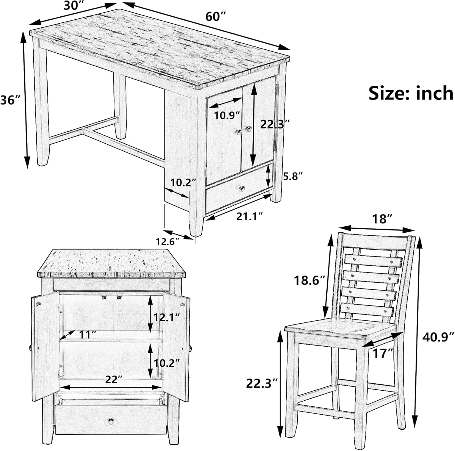 5-Piece Counter Height Wood Dining Table Set with Faux Marble Tabletop, Storage Cabinet and Drawer & 4 Matching Chairs, Dark Walnut