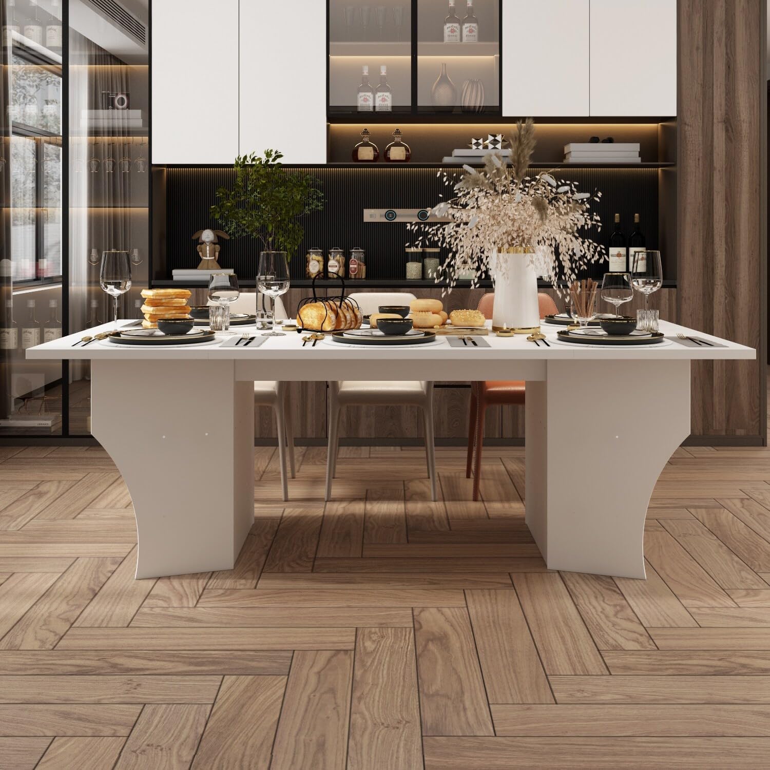 All-in-one Office Computer and Dining Table with Sculptural Supports 86.6"x43.3" White Glam Modern Contemporary Urban Rectangular MDF Matte Storage