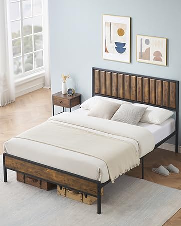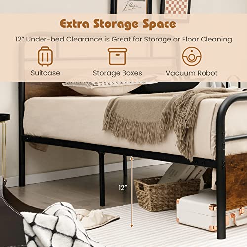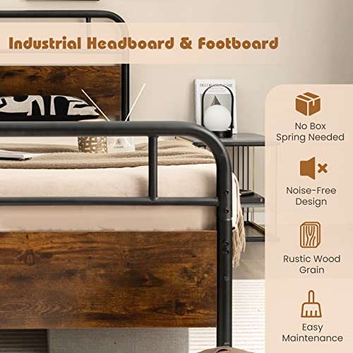 Giantex Full Size Metal Bed Frame with Wood Headboard and Footboard, Heavy-duty Platform Bed with Strong Metal Slats Support, Industrial Mattress Foundation No Box Spring Needed, Rustic Brown