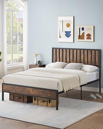 GAOMON Platform Queen Bed Frame with Rustic Vintage Wood Headboard, Mattress Foundation, Strong Metal Slats Support, No Box Spring Needed