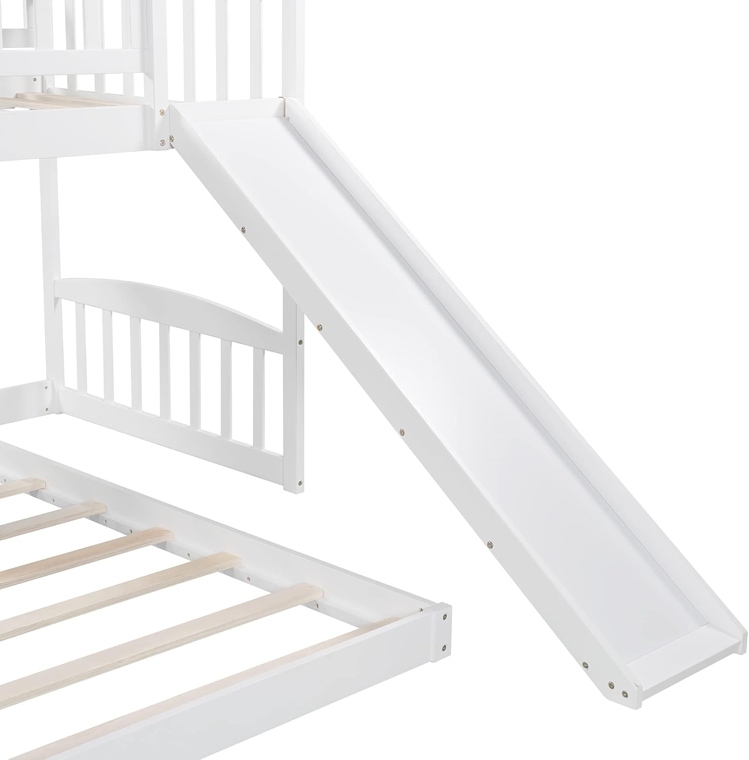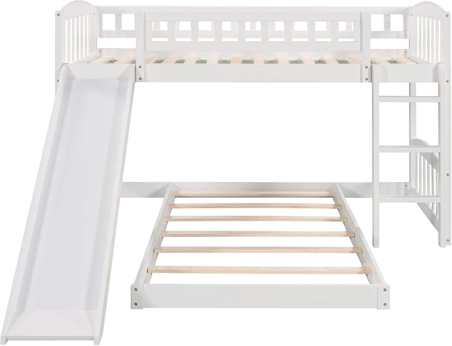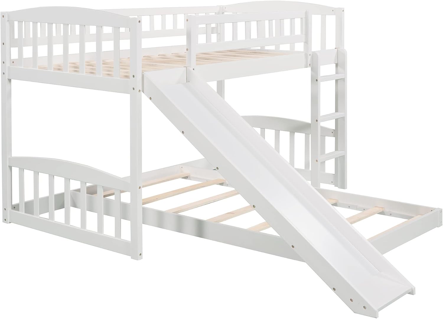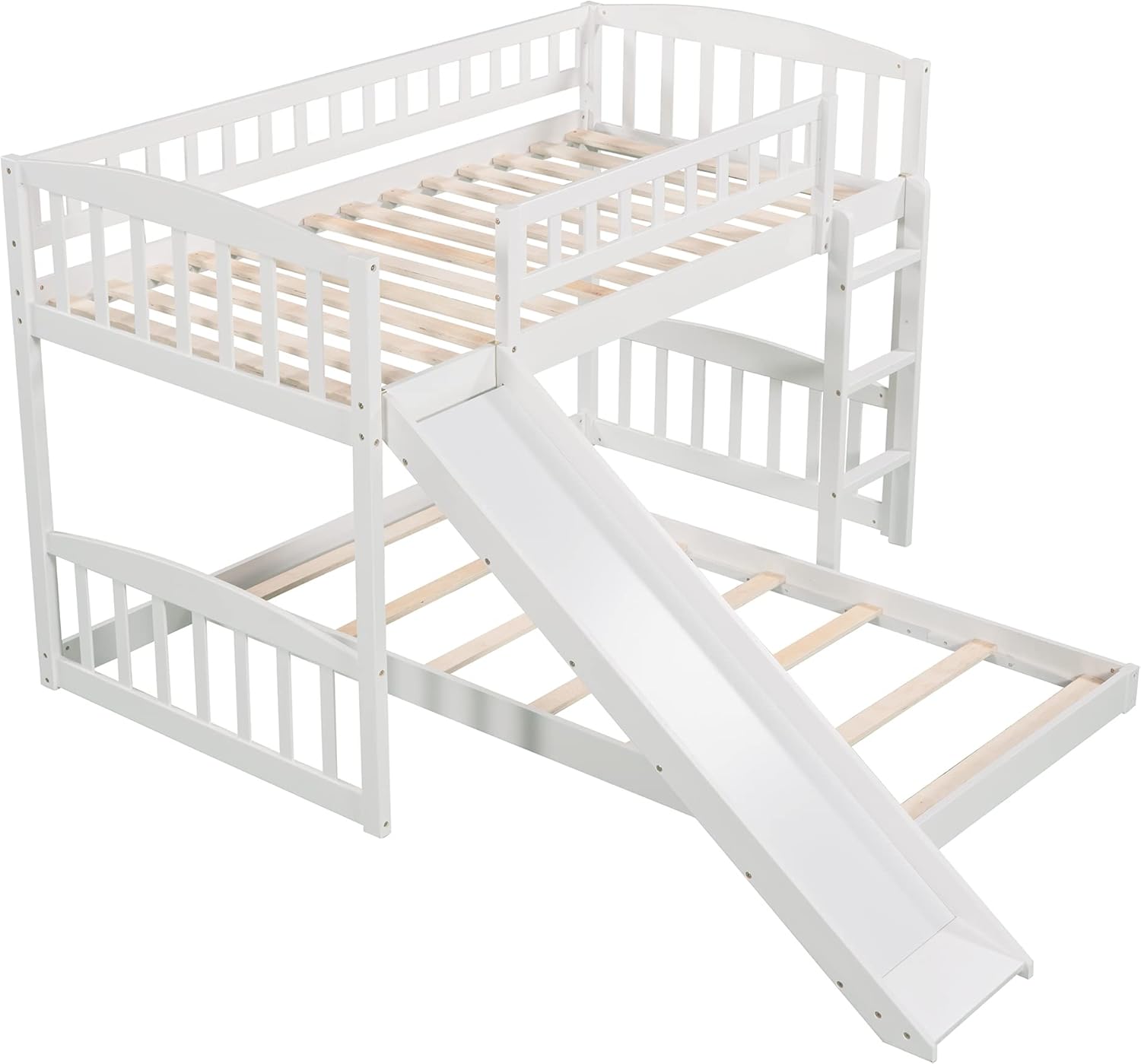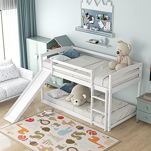 Harper & Bright Designs Low Bunk Bed Twin Over Twin, Wood Floor Bunk Bed with Slide and Ladder, L-shape Bunk Bed for Kids Toddlers Teens Boys & Girls (White)