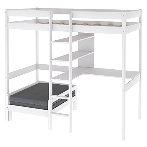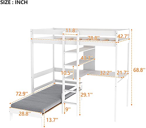 Convertible Loft Bed with L-Shape Desk, Wooden Bunk Bed with Shelves and Ladder for Boys and Girls,White