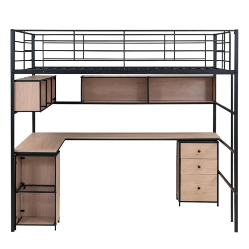 Full Size Metal Loft Bed with Bookcase and L -Shaped Desk, Heavy Duty High Loft Bed Frame with Open Cabinet and Built-in Ladder for Small Room, Dormitory, Apartment, Bedroom (Black, Full)