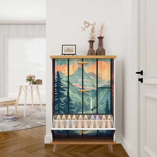 3 Drawer Shoe Cabinet, Artistic Shoe Cabinet, Mountainous Landscape Art Walnut Maple Wood Wood Shoe Rack Organizer for Entryway Slim (31.5”W x 9.45”D 46”H)