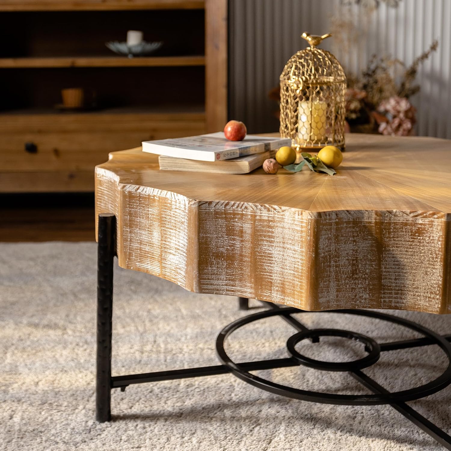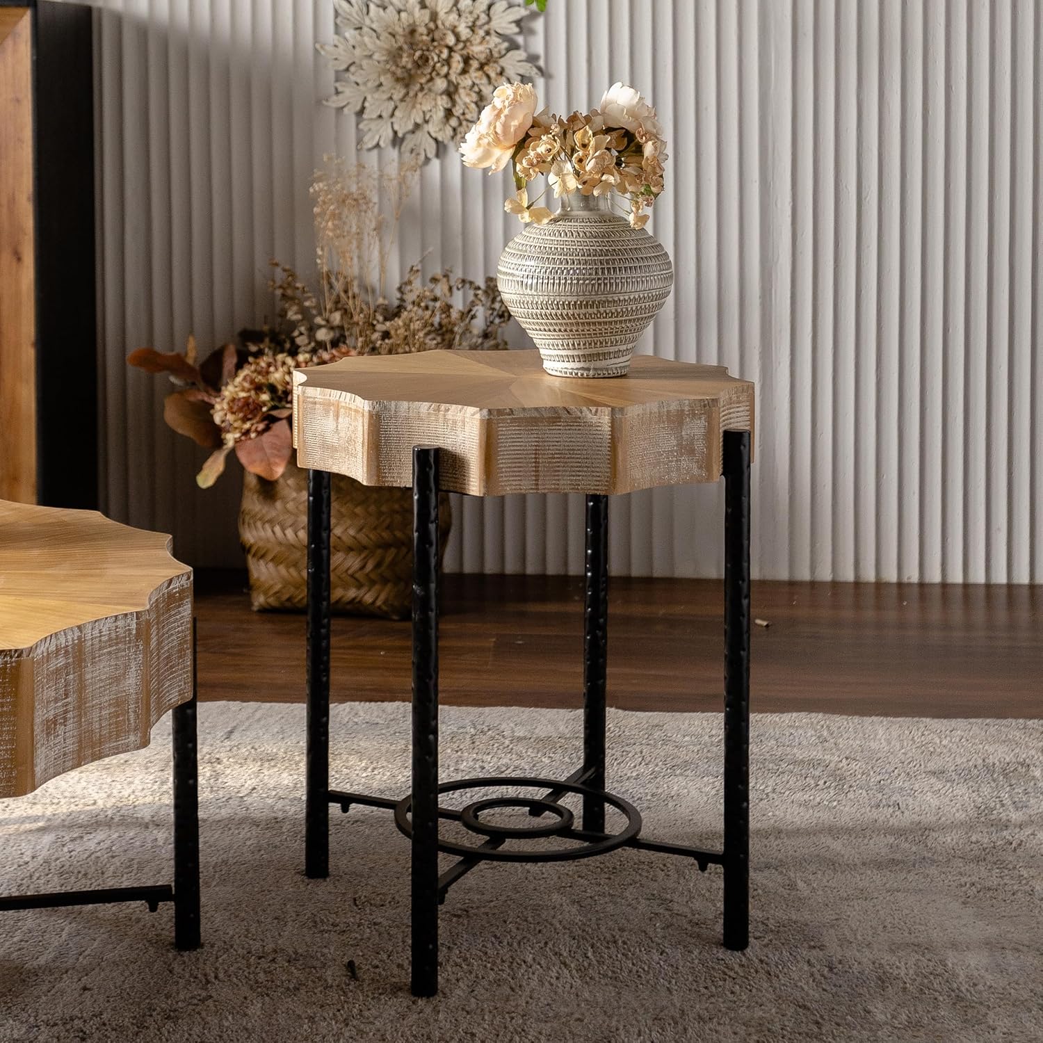 Wood Coffee Table Set of 2, 31.5‘’+18.5‘’ Vintage Splicing Lace Shaped Coffee Table with Fir Wood Table Top and Dimpled Metal Cross Legs, Coffee End Table for Living Room