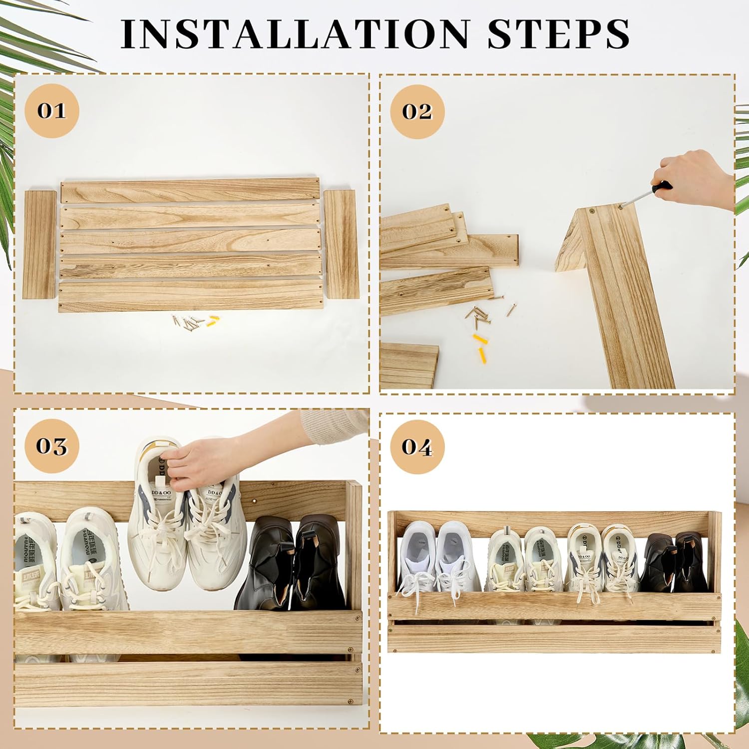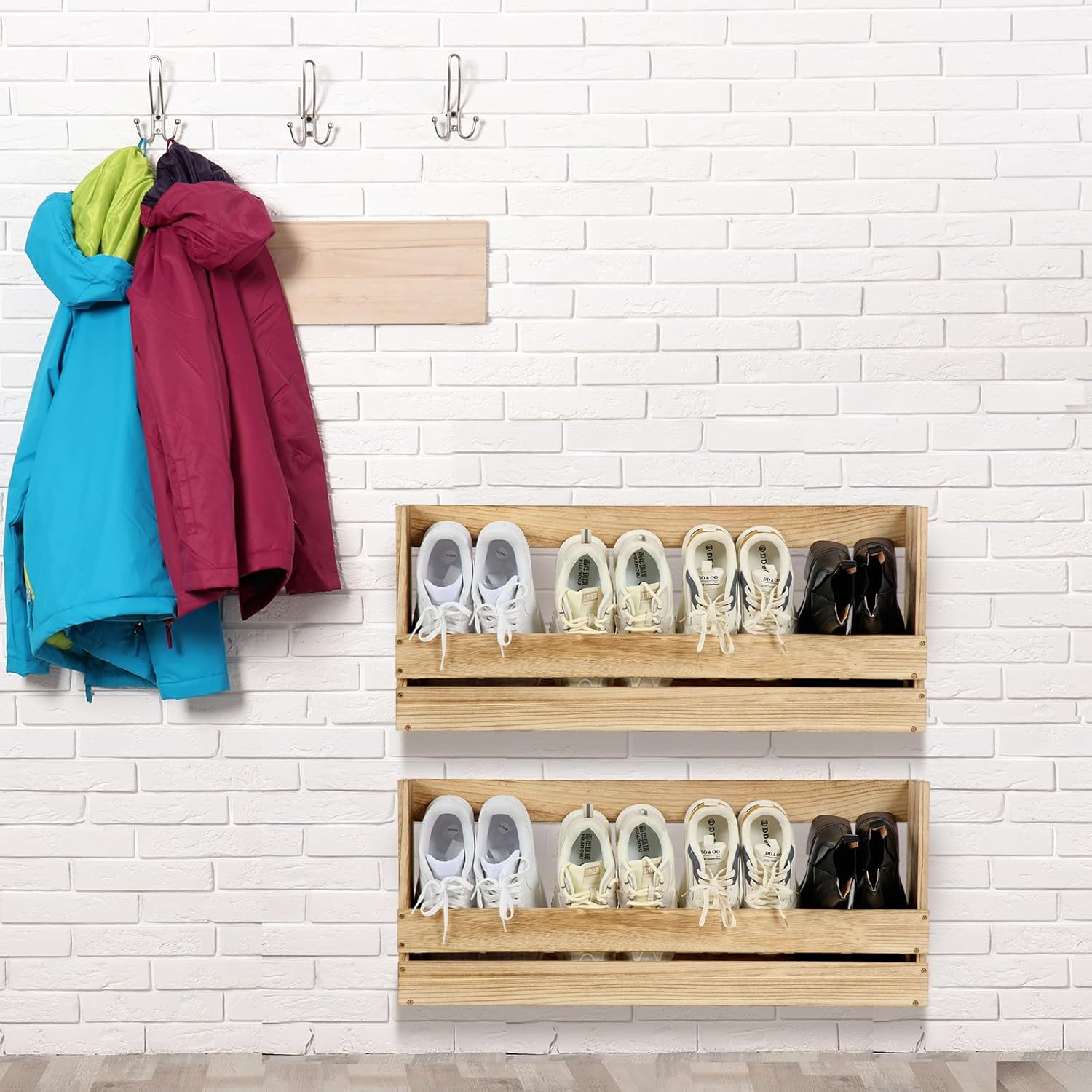 2 Pcs Wall Mounted Shoe Rack Wooden Shoe Rack Organizer Wall Shoe Holder Modern Compact Wood RV Shoe Storage for Sneaker Kid Footwear Slipper Boots Entryway Narrow Spaces Hallway(32'' Long)