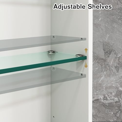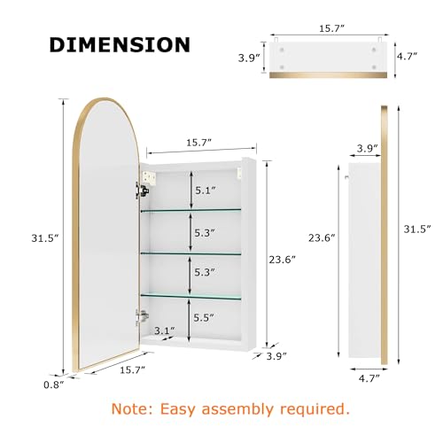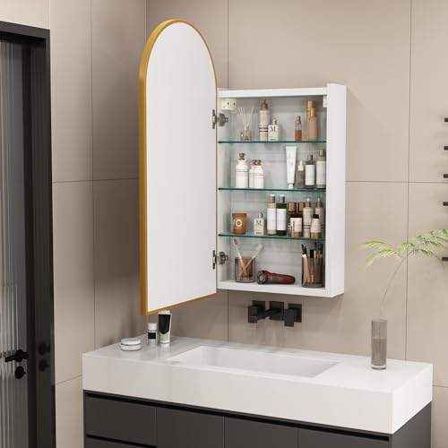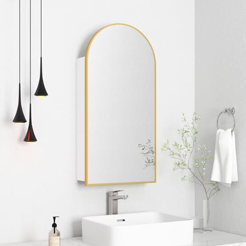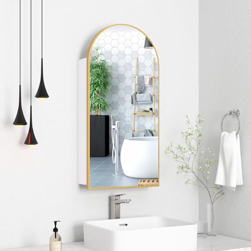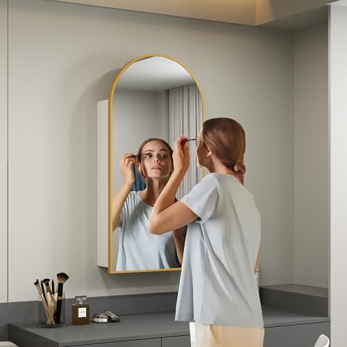 Gold Arched Medicine Cabinets with Mirror, Bathroom Metal Framed Mirrored Medicine Cabinet, Wall Surface Mounted, Vintage Vanity Mirror with 3 Adjustable Storage Shelves, Not Recessed, 16x31 Inch