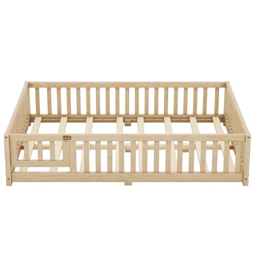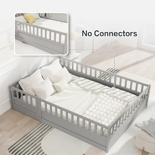 LLS Full Size Floor Bed with Slats, Wooden Montessori Floor Bed with Heightened Fence and Door for Boys Girls Bedroom, Grey