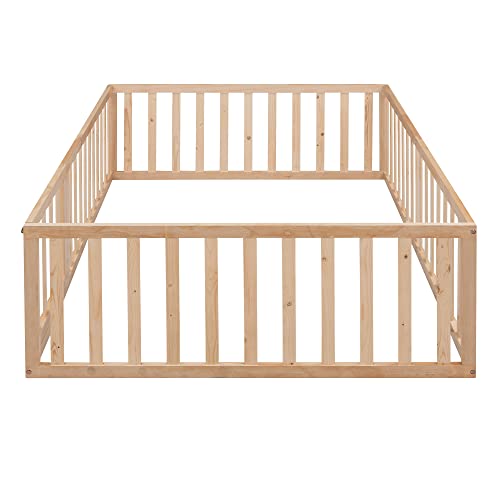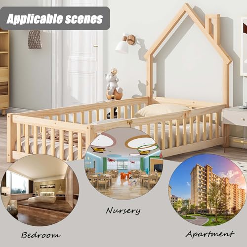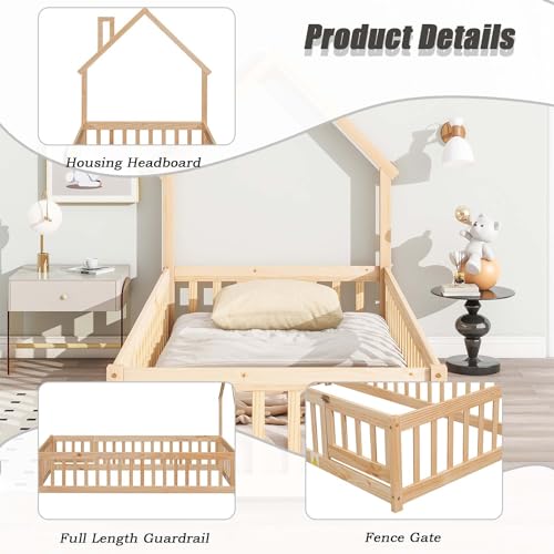 Twin Size Floor Bedframe Wooden Montessori Platform Bed with Safety Guardrails Fence and Door