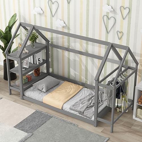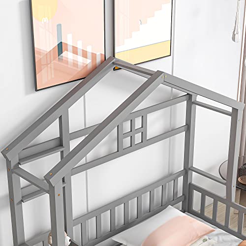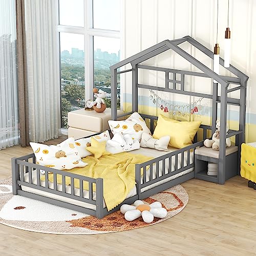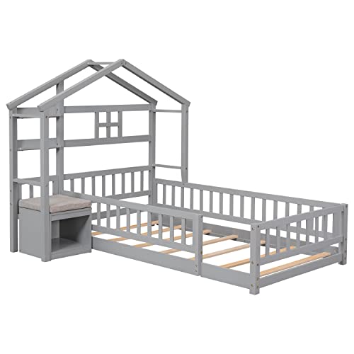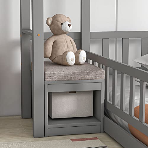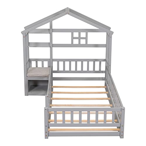 Floor Bed with Fence Railings and House Shape Headboard, Twin Size House Beds with Cushioned Nightstand and Wooden Slats Support, Kids Montessori Style Playhouse Bed Frame for Girls Boys, Gray