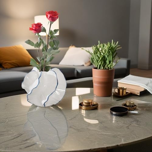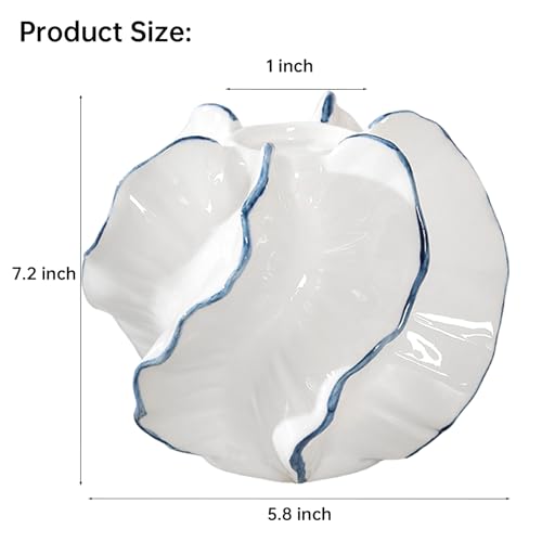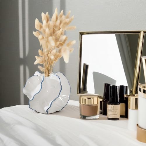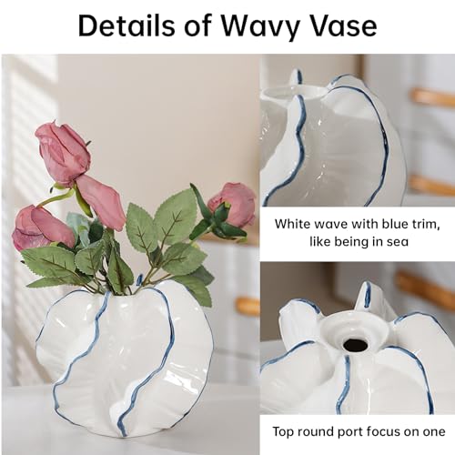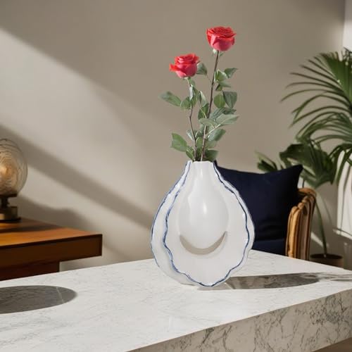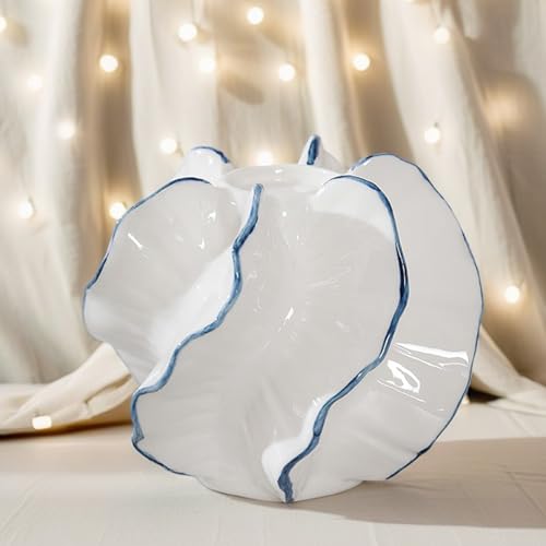 White Ceramic Oysters Vase with Blue Edge, MODUSKYE Modern Wavy Design, Nautical Theme Hydroponic Flower Vase for Table, Fireplace, Shelf, Mantel, Entryway and Centerpieces Home Decor(Oysters)