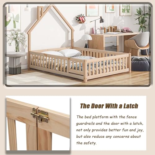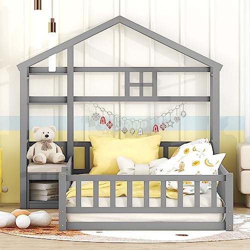 Full Size Montessori Floor Bed Frame with House-Shaped Headboard and Fence, Wooden Platform Bed Frame with Full-Length Guardrails and Door for Toddler Girls Boys (Grey, Full)