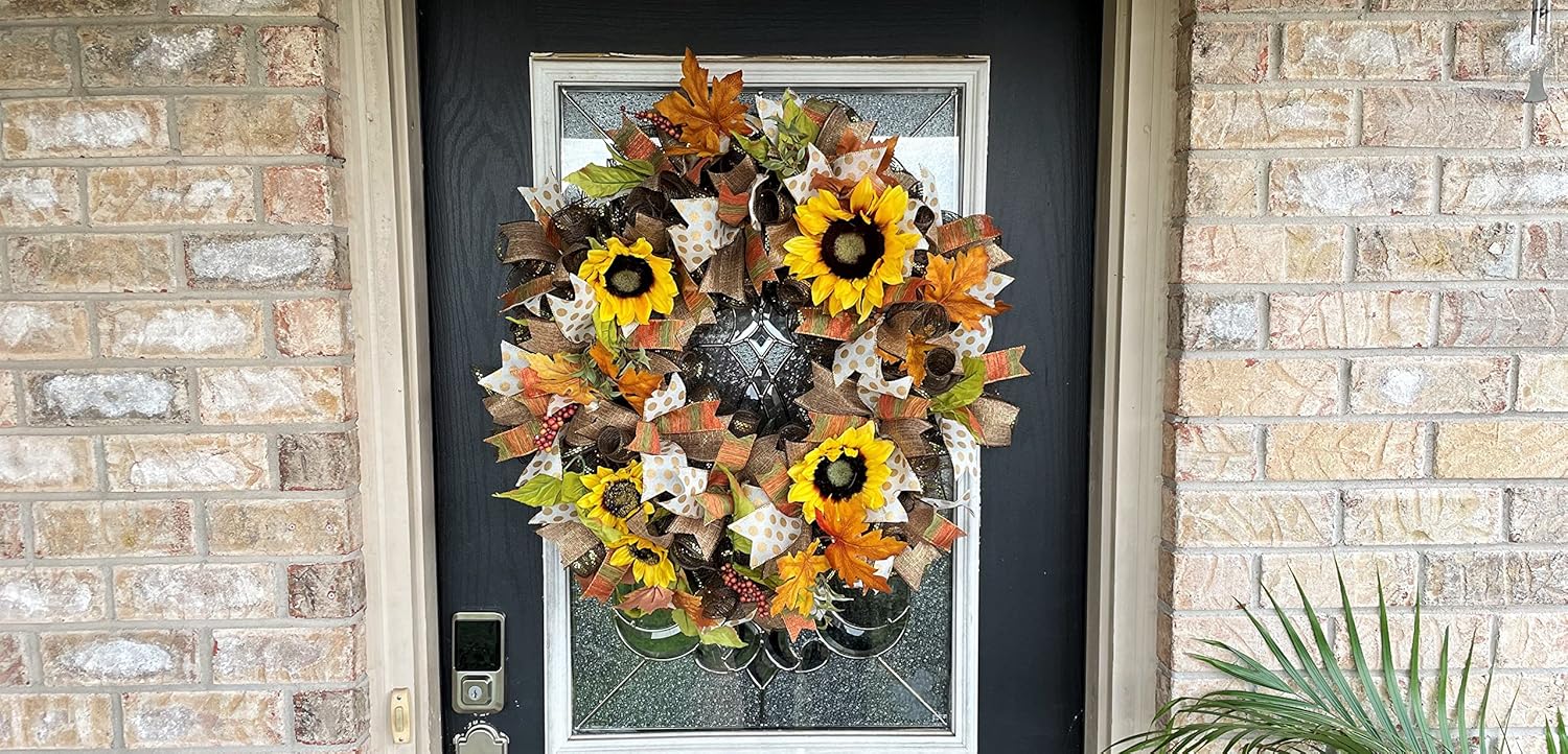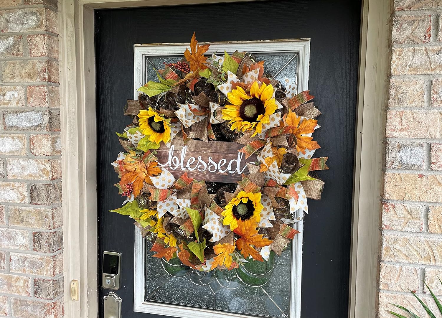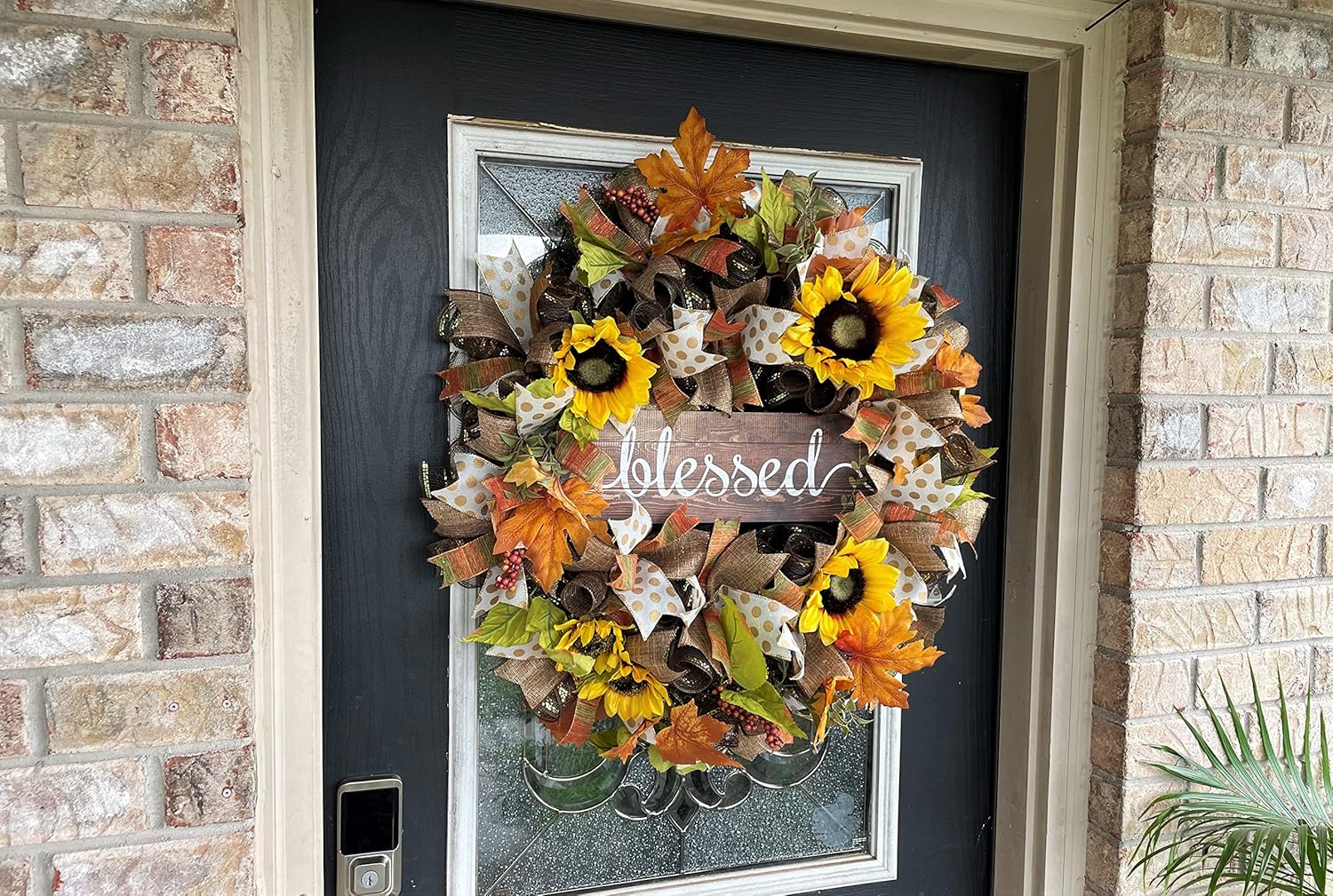 XL BLESSED Stunning Fall Thanksgiving Sunflower Floral Fall Brown Polka Dot Deco Mesh Front Door Wreath, Door Hanger, Country Home, Farmhouse Decoration, Porch Sign